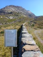 Von der Bergstation Kreuzboden auf dem Gsponer Höhenweg bis Grüebu, nach der Brücke die Güterstrasse hoch bis zur markanten "Chinesischen Mauer", ab da sehr gut blau weiss markiert. Meist Block- oder steiles Wiesengelände. Die wenigen Kraxelstellen sind umsichtig mit Kabeln gesichert. Techn. unschwierig und nicht ausgesetzt.