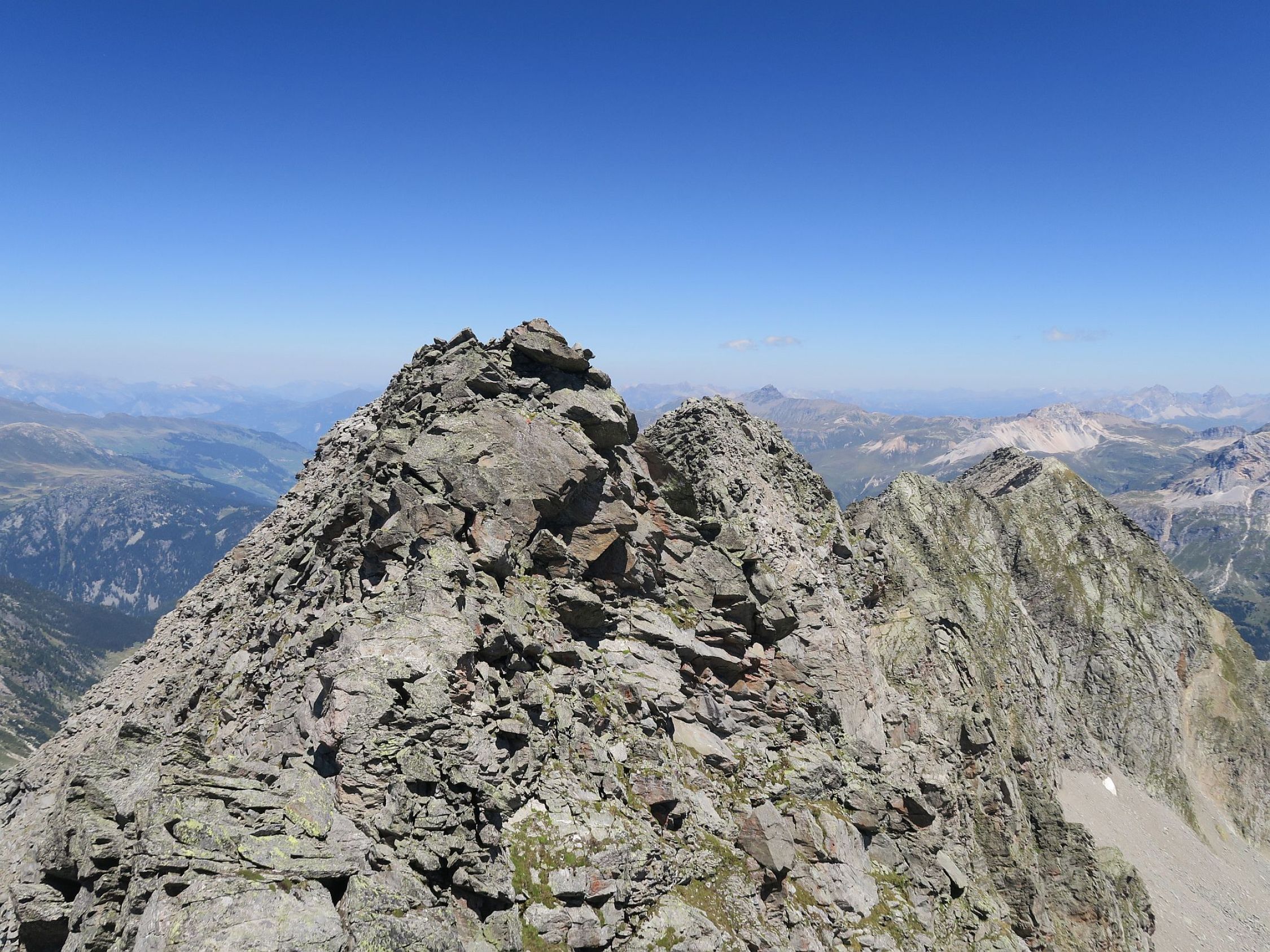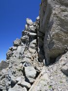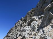 Wir stiegen rechts um diese Felsen und konnten so diese Wand wie auf einer Terrasse übersteigen, dann kommt die Schlüsselstelle der Tour. Eine ausgesetzte, aber gut gestufte Stelle, wo wir hart am Felsen um eine Kante steigen konnten und dann wieder in eine Art Kamin, wo der Fels fest und solide war. Ich würde diese Stelle mit einem II bis III taxieren. Da wir sonst ausgesetzte Stellen meiden, bin ich mir mit der Bewertung nicht so sicher…. Über diesem Kamin erreichten wir den oberen Teil der Mittelrippe. Dort oben ist dann wirklich nur noch T4 Kraxelgelände bis zum Gipfel.