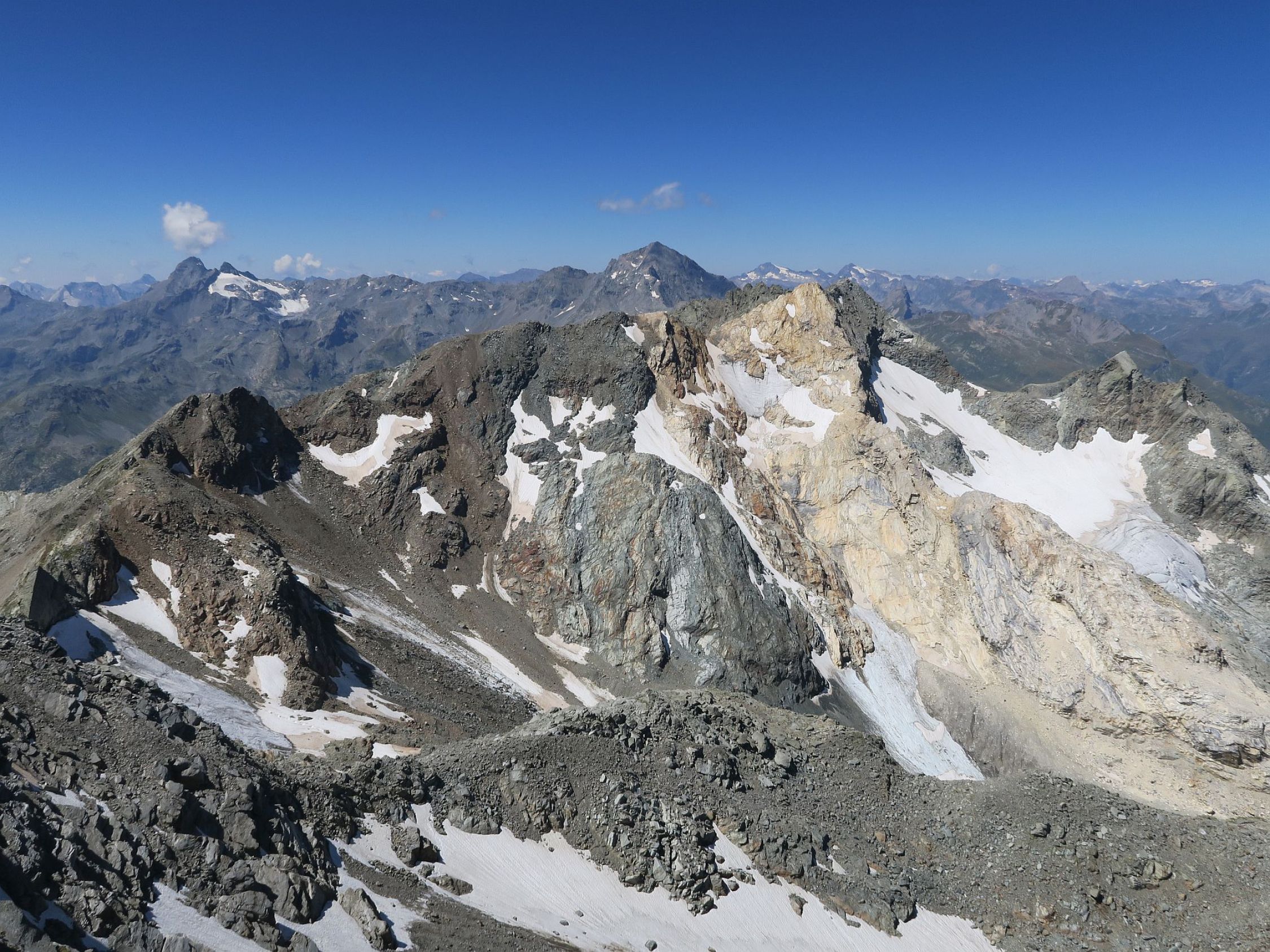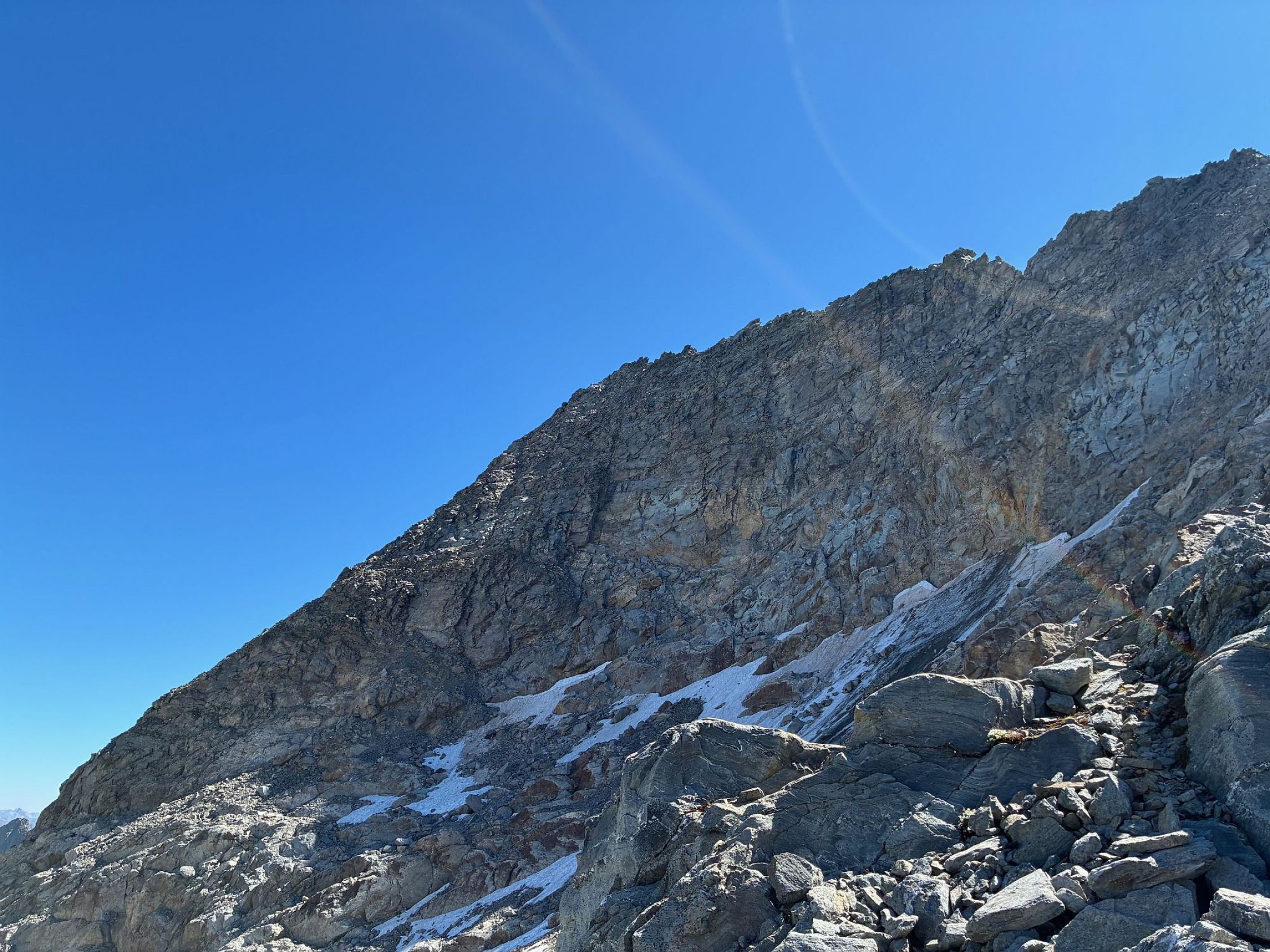 Hinter der Boccetta ein kurzer steiler Abstieg auf den Gletscher bzw. das Firnfeld. An seiner Kante oben unterhalb der Felsen traversieren, dazwischen über ein weiteres steiles Firnfeld zum Blockgeröll, welches auf die Kante führt, wo dann der Gipfel in Sicht kam. Diese überschritten wir und traversierten zum Fuss der Nordwestrippe