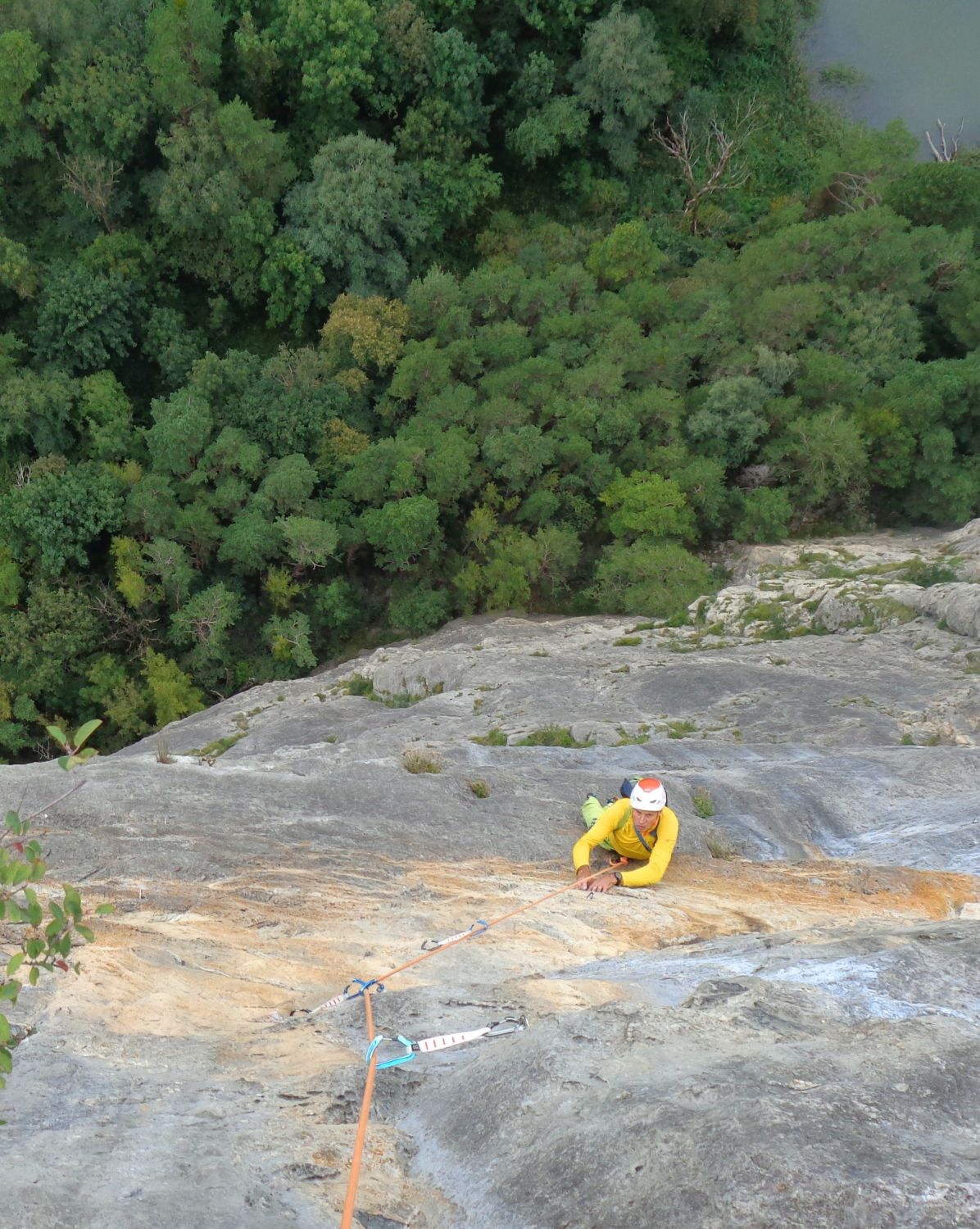 Die Route (T. Wälti 2001, saniert 2022) ist sehr abwechslungsreich und bietet besonders schöne Kletterei in phantastischem Fels, meist noch sehr rauh. Die Absicherung ist gut+, aber zur rein technischen Lösung sind die Bh nicht dicht genug. Entscheidende Schwierigkeiten liegen auch zwischen den Bh. Man könnte zwar davor ausruhen, aber wer dann nicht 6b/c vom Haken wegklettern kann, kommt nicht an den nächsten Fixpunkt, bzw nicht die Route hoch. Das kann bei SL6/7 zu einem recht komplexen Rückzug führen (wegen Quergängen). Die Orientierung ist einfach (immer den Bh nach), aber das „lesen“ der Einzelstellen kann mitunter komplex sein.