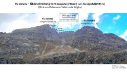 Von La Veduta über das SW-Couloir („Nomen nescio“) zum S-Gipfel mit anschließender Gratüberschreitung zum N-Gipfel, Abstieg über NW-Grat ins Valletta dal Güglia und zur Alp Güglia