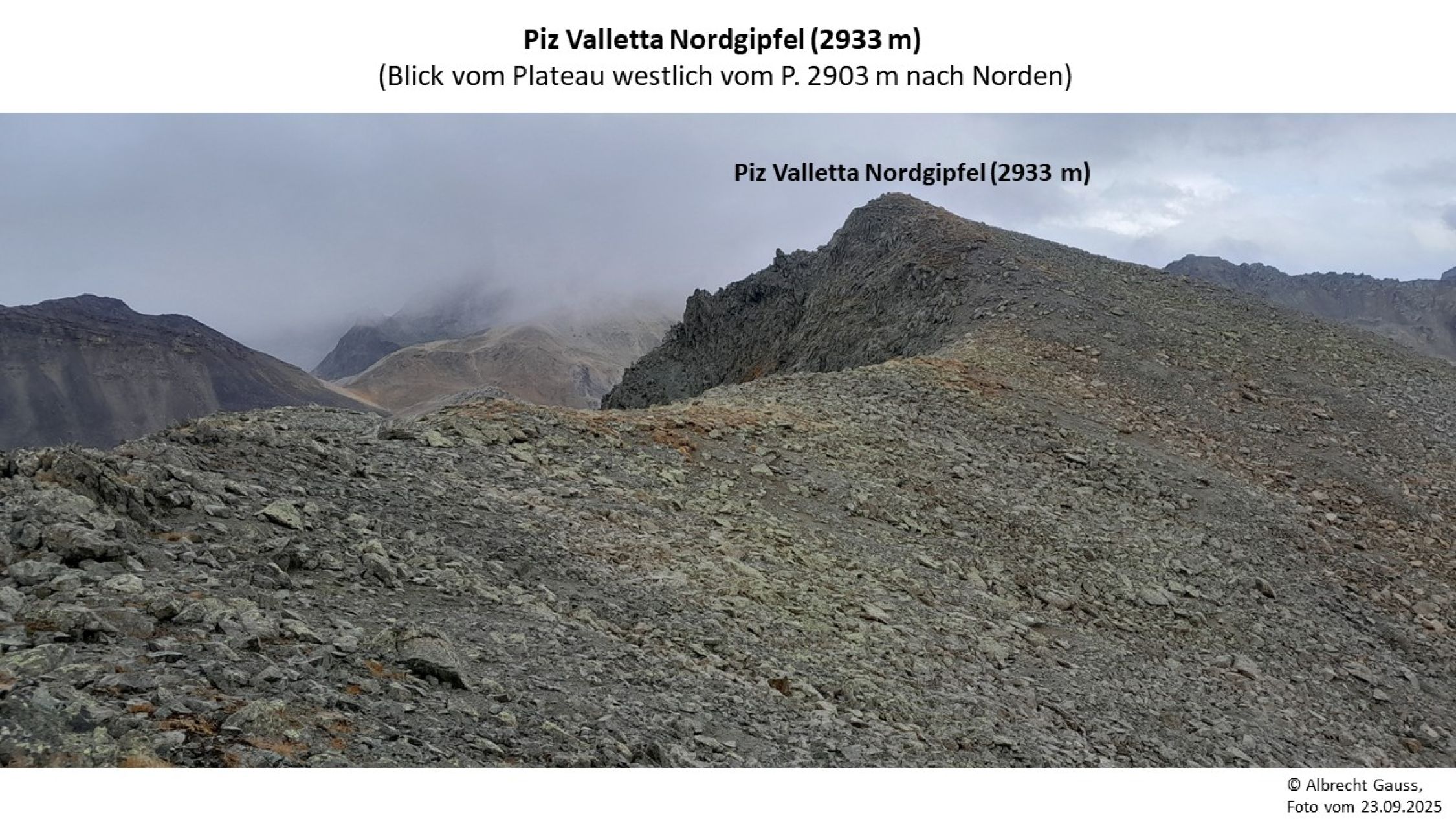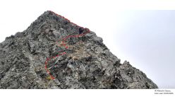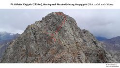 Der Abstieg am Grat vom S-Gipfel nach N und ein weiterer Abstieg von der nächsten Graterhebung ("Zwischengipfel") in die folgende tiefste Scharte im Grat (ca. 2869 m) sind exponiert und mit zum Absturz bereiten brüchigen Felsen kontaminiert (I–II, T4–T5). Nach dieser zweiten (tiefsten) Gratscharte ist der weitere Gratübergang und -aufstieg zum N-Gipfel vergleichsweise sehr einfach. Ab dieser Scharte scheinen auch immer wieder "Notabstiege" auf die W-Seite recht leicht möglich. Im weiteren Gratverlauf kann man anfangs auf der W-Seite, am Ende auf der O-Seite schwierigeren Passagen ausweichen und erreicht so das Plateau auf 2903 m. Von dort in wenigen Minuten auf Schutt zum N-Gipfel.