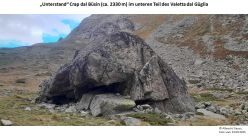 Letztlich gelangt man vom P. 2726 m über angenehme, wenig steile Rasenschrofen in die Valetta dal Güglia und durch dieses Tal auf dem in der LKS eingezeichneten Pfad (die Umzäunung oberhalb der Julierstraße wird rechts [W] umgangen) zur Postautohaltestelle bei der Alp Güglia (2199 m). Eine Unterstandsoption findet sich im unteren Teil des Valetta dal Güglia, der sog. Crap dal Büsin (ca. 2330 m).