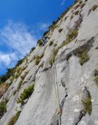 Ein echter Klassiker am Südturm, erstbegangen 1983 von Martin Wiesmann und Kollegen. Heute deutlich weniger Begehungen pro Jahr, als vor 30 Jahren. Daher noch guter unverbrauchter Fels. Der untere Teil bietet absolut lohnende, rassige Kletterei in bestem Fels. Natürlich mit etwas Botanik, aber eher weniger als in der benachbarten Maguggi. Die Absicherung auf den ersten 4 SL ist gut+ (wenn man auf SL2-4) im Zweifel mal etwas dazulegt). Die erste SL ist für Schafbergverhältnisse steil und athletisch und sehr gut gesichert. Obwohl formal am schwersten bewertet, ist sie technisch am wenigsten anspruchsvoll. In den Platten darf man sich manchmal weit nach Schlitzen strecken, manchmal sehr fein stehen und dann wieder via Mantles hochschieben. Die Schwierigkeit ist recht durchgehend 6/6+. SL5 ist nicht mehr so recht lohnend (man zieht sich an Latschen und nicht mehr so festem Fels hoch), aber der Stand ist OK. SL6/7 werden selten besucht. Eigentlich ganz eindrücklich und mal ein Erlebnis auf den Südturm zu kommen, aber nicht so recht im modernen Stil gesichert… Man kann am Schluss auch die Südturmschlucht absteigen.