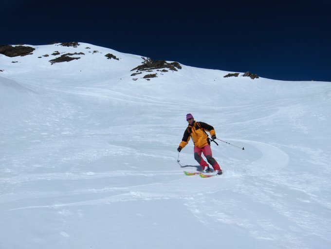Sämtliche gängigen Aufstiege sind hier beschrieben. Direkt vom Gipfel se-wärts abfahren. Nach 100 Höhenmeter in Fahrtrichtung links in die grosse Halde queren. Von hier der Falllinie nach auf Höhe 2400 und anfellen. (Bei guter Kondition lohnt sich auch von hier aus die Abfahrt hinunter zum Säss).