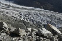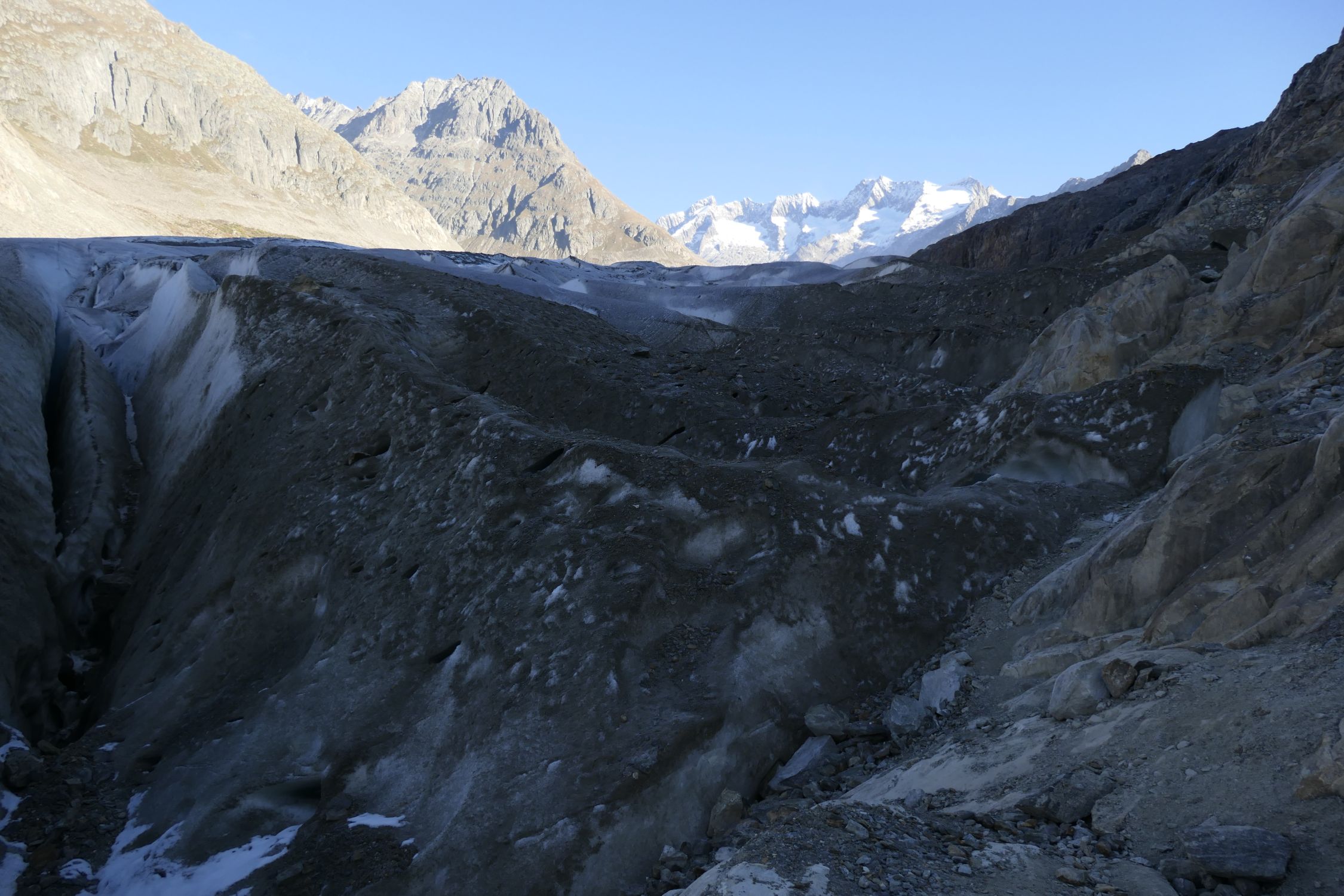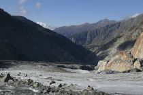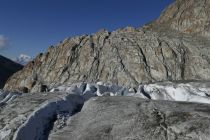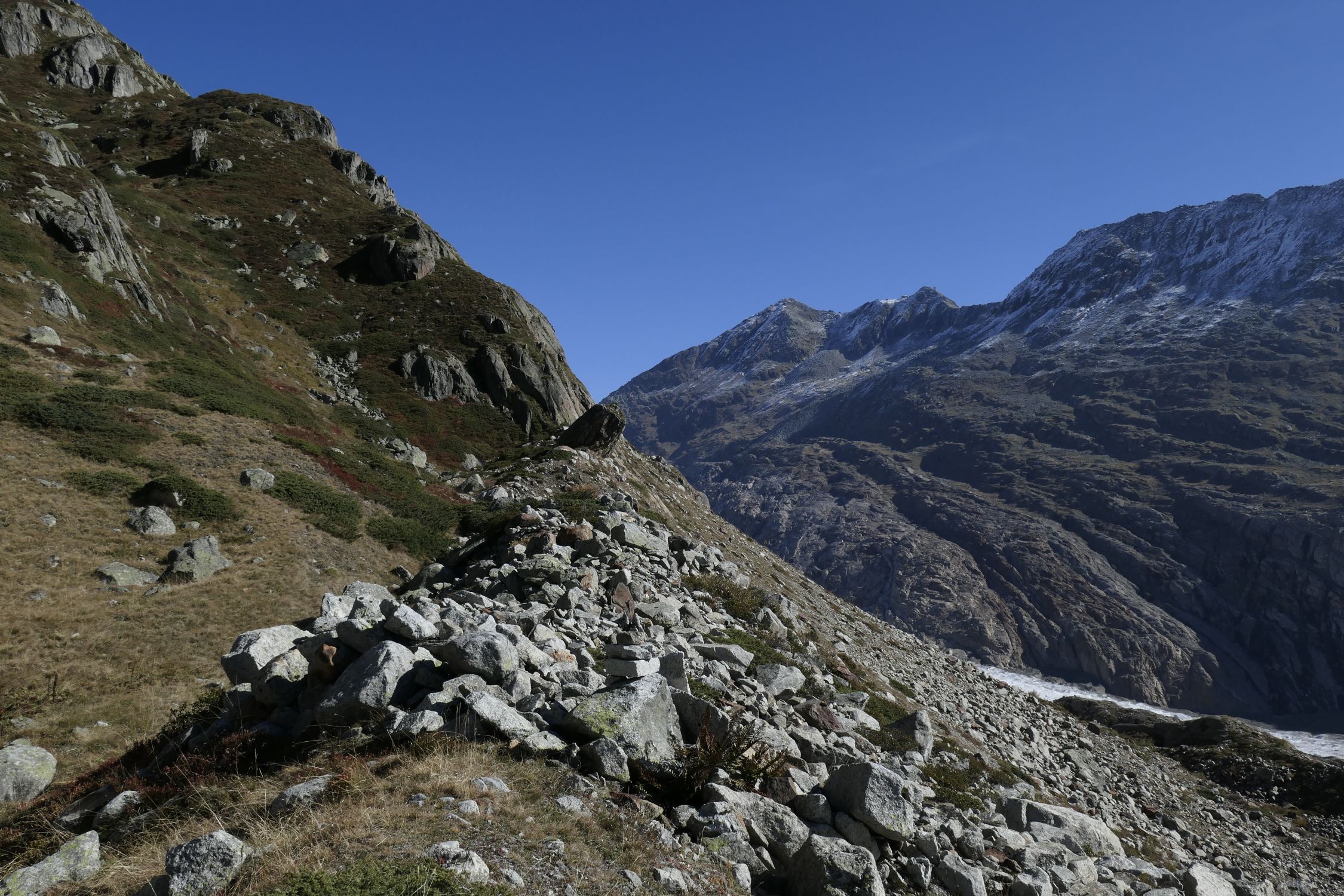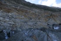 In zunächst etwas mühsamem, aber recht gut begehbarem Moränenschutt, z.T. über steilem Toteis, steigt man die erwähnte Rinne empor. Nach deren höchstem Punkt sucht man sich zwischen den Felsbuckeln eine Route in westlicher Richtung schräg aufwärts bis zum Kamm der deutlich sichtbaren Moräne, die man bei der in der Karte eingezeichneten Ruine einer ehemaligen einfachen Alphütte anpeilt. Hier zeigt ein kleiner Steinmann, dass man richtig ist.