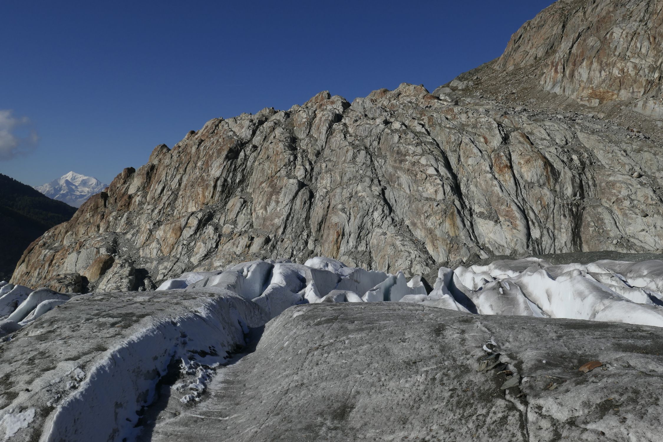 Wo der Pfad aufhört, ist der Gletscher aktuell (anfangs Oktober 2025) gut zu erreichen. Zu Beginn gibt der Verlauf der Randspalten die Marschrichtung vor. Man überquert den Grossen Aletschgletscher (oder das, was von ihm noch übrig geblieben ist) in nördlicher Richtung und peilt auf der gegenüberliegenden Seite die Rinne an, die von Pt. 2105 Richtung Nordosten zum Gletscher abfällt. Im mittleren Bereich gibt es kaum Spalten, sodass man zu keinen Umwegen gezwungen ist. Wo die beschriebene Rinne das Eis erreicht, werden die Randspalten zahlreich. Man schlägt von Anfang an einen grosszügigen Bogen nordwärts ein und findet dann einen Bereich, wo sich spaltenparallel der Gletscherrand erreichen lässt.
