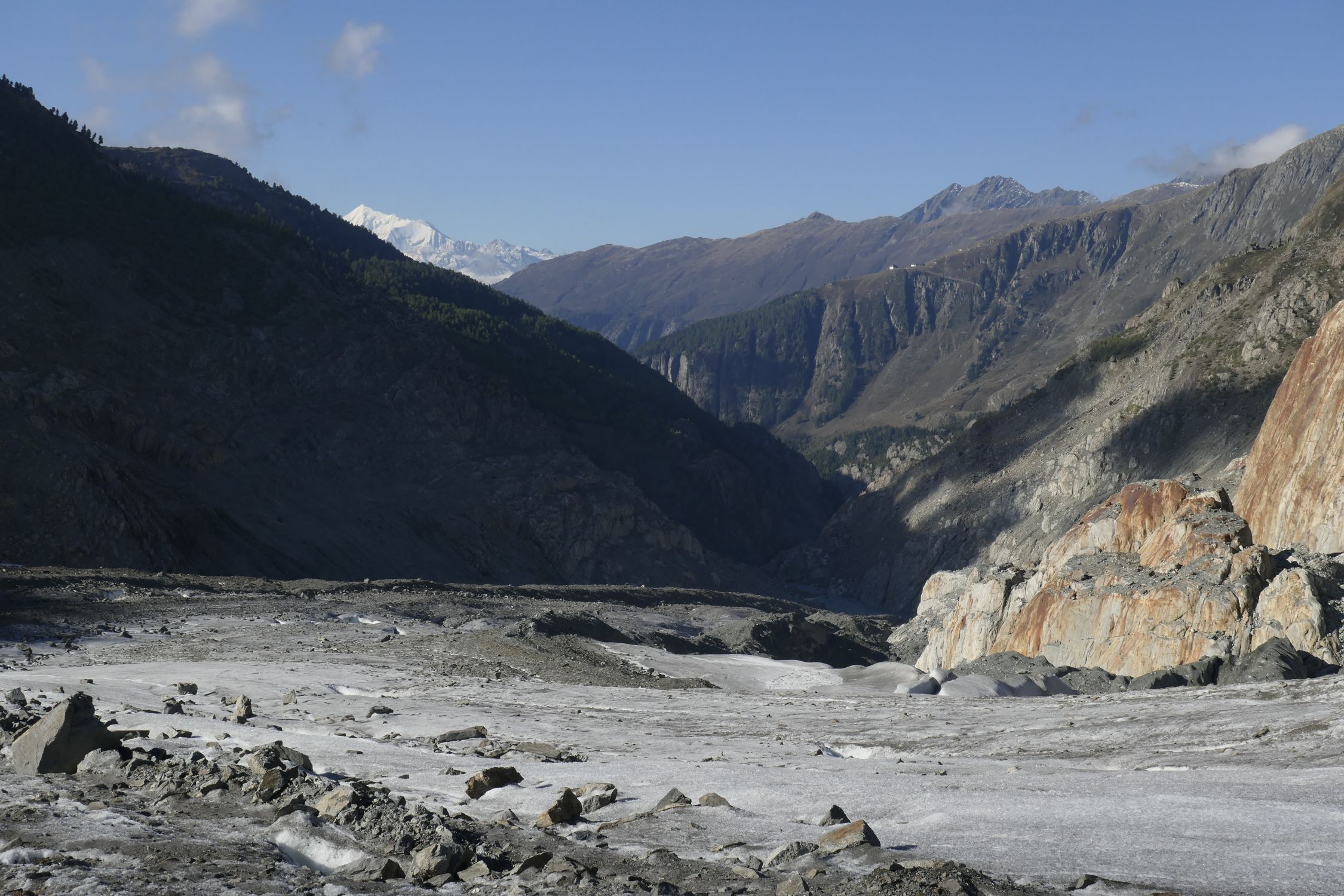 Von der Bettmeralp steigt man auf dem Wanderweg nach Biel hinauf. Hier wird die Sicht auf den Gletscher frei. Ein Wegweiser leitet abwärts Richtung Chatzulecher und Gletscherrand. Der zunächst rot-weiss markierte Weg geht nach dem steileren Abstieg in eine blau-weiss markierte Route über. Bald schon verschwinden die Markierungen, der Pfad bleibt aber deutlich sichtbar. Der Gletscherschwund hat einige kleinere Felswände freigegeben, die der gut eingerichtete Pfad im Zickzack z.T. mit Fixseilen auf Bändern geschickt überwindet. Das Gelände ist recht unübersichtlich, die Route in Richtung Gletscher aber leicht zu finden. (Umgekehrt wäre es wohl ziemlich anspruchsvoll, aus dem Gletscher auszusteigen - deshalb rate ich ausdrücklich zur Begehung in der hier beschriebenen Richtung.)