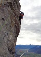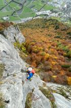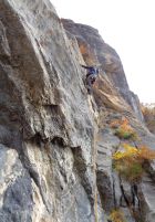 SL4 (20 m, 6b+): Jetzt zum Kontrastprogramm. Große klare Griffe (Schuppen). Wer gerade nichts findet faßt im Zweifel weit nach l oben…. Dicht gesichert, schöne steile Passagen. Deutlich leichter als SL3.