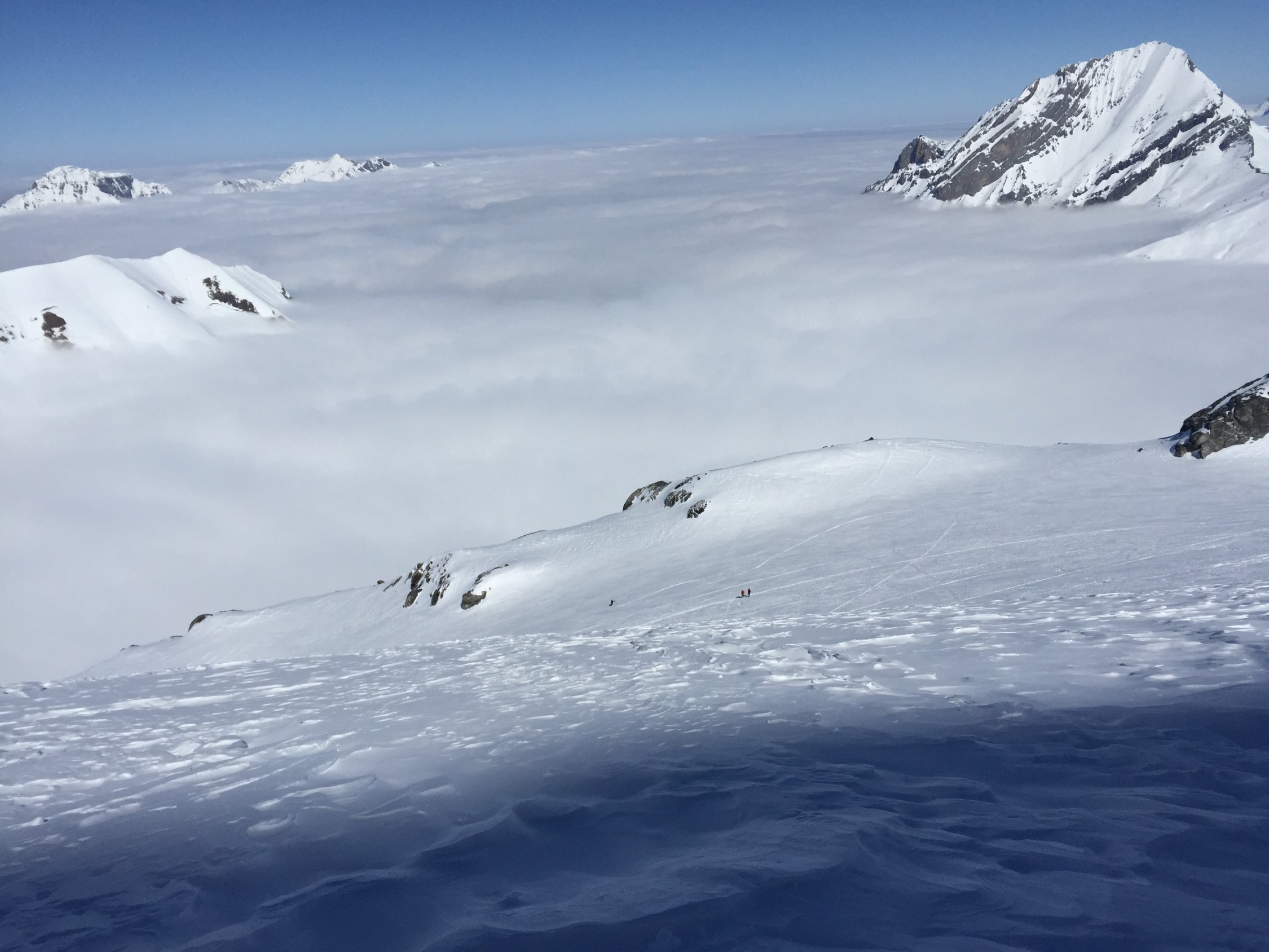 Abfahrt bis unterhalb Frühstücksplatz in etwa der Aufstiegsroute, auf ca 2750m kann man sich dann entscheiden, ob man weiter entlang der Aufstiegsspur abfahren möchte oder südöstlich abschwenken will und direkt ins Skigebiet über Flyschwend abfährt. Die flachen Meter in der Ebene kann man dann mittels Skating oder Benützung des Schlepplifts zurücklegen.