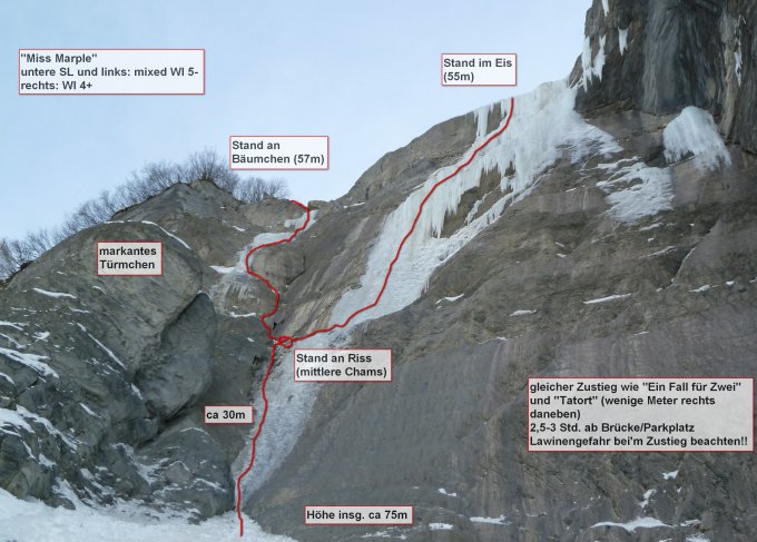 "Miss Marple" bietet angenehme Mixed-Kletterei und schönes Eis im oberen Rechten Teil.