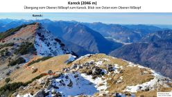 Alternativ kann man (wie am 04.11.2025) nach Rückkehr zur Weilheimer Hütte auf Pfadspuren nach N über den S-Grat zum Oberen Rißkopf (2049 m) aufsteigen und dann weiter, anfangs dem Grat entlang, nach W gehen. Man muss aber bald in die S-Flanke absteigen (T2‒T3, je nach Variante), um steilen Felsabbrüchen am W-Grat des Oberen Rißkopfes auszuweichen. Später wieder Richtung W ziehend kommt man in eine Scharte am Fuß des Kareck-O-Grates (ca. 1989 m). Auf Pfadspuren, im unteren Teil nord-, im oberen Teil südseitig, erreicht man leicht (T2) den Gipfel des Karecks 2046 m) (Gipfelkreuz). Für den Abstieg steigt man am besten wieder wenige Meter zurück Richtung O, bis man nach S über Rasenschrofen weglos absteigend (T2‒3) eine Lücke zwischen den Latschen findet, um ca. 60 bis 80 Hm tiefer den Wanderweg von der Weilheimer Hütte Richtung Oberau bzw. zum Bischof bzw. Hohen Fricken zu erreichen. Auf diesem Weg Richtung W bzw. später SW bis zum Sattel zwischen Henneneck und Bischof (1869 m, Wegschilder, Holzkreuz). Von hier könnte man ggf. auch durch einen weglosen Abstieg von 220 Hm Richtung O die Basis der Materialseilbahn und wieder den bequemen Weg zur Esterbergalm erreichen.