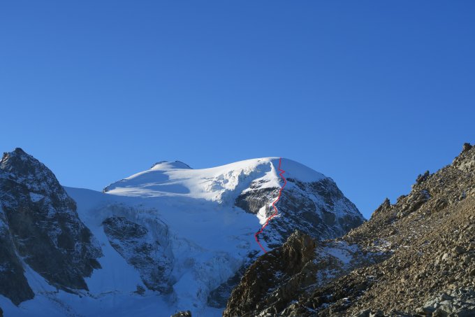 Auf- und Abstiegsroute sind selbsterklärend. Schwierigkeiten im mittleren Teil des Grates können meistens links umgangen werden. Entscheidend für die Wegfindung im Auf- und Abstieg, auf dem Gletscher, ist die Spaltensituation. Diese muss jedes mal neu beurteilt werden.