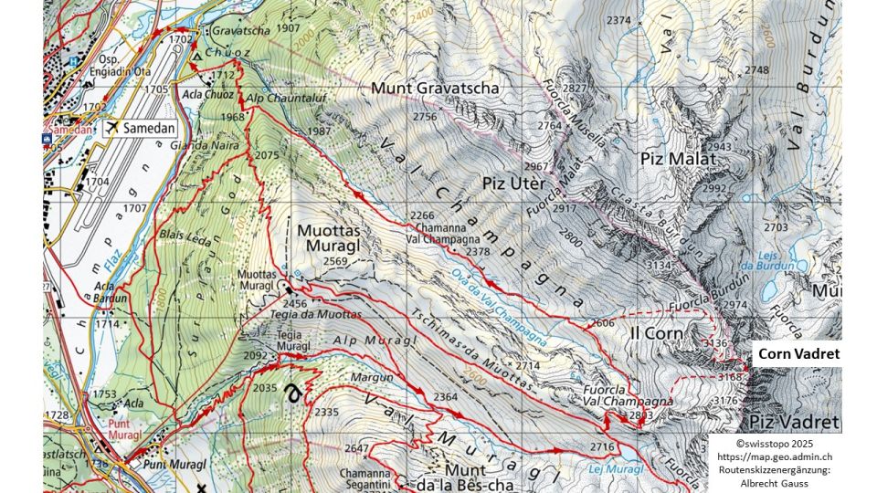 Überschreitung des Corn Vadret (von Punt Muragl über Lej Muragl zur Fuorcla Val Champagna und die W-Flanke und den S-Grat zum Gipfel; Abstieg über N-Flanke und Val Champagna nach Samedan RhB)