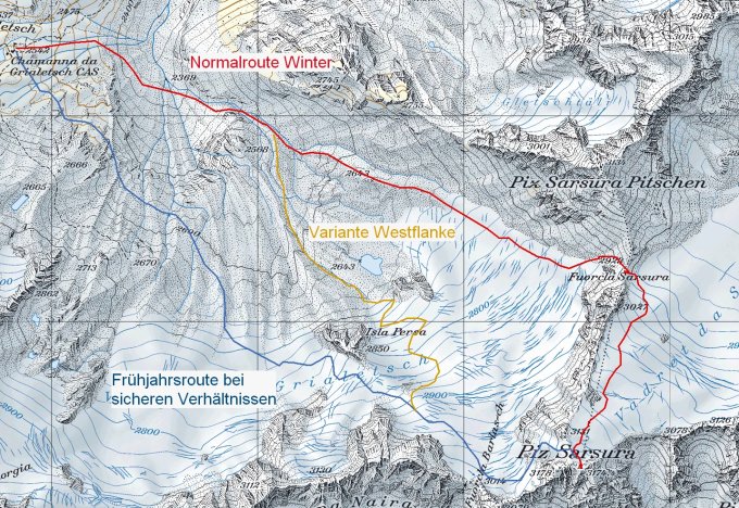 Von der Hütte steigt man in SW Richtung direkt bis auf ca 2600 m auf. So vermeidet man die lawinengefährdeten Abhang südlich der Hütte. Auf ca. 2650 m quert man bis an den Fuss des Vadret da Grialetsch. Weiter südlich der Isla Persa einen etwas steiler Hang hinauf. Oben wieder flacher an den Fuss des NW Hanges des Piz Sarsuara. Nach Norden steile Querung des Westhanges auf die Schulter. Dort Skidepot und zu Fuss auf dem Nordgrat zum Gipfel. (oft sehr abgeblasen, hart und schmal).