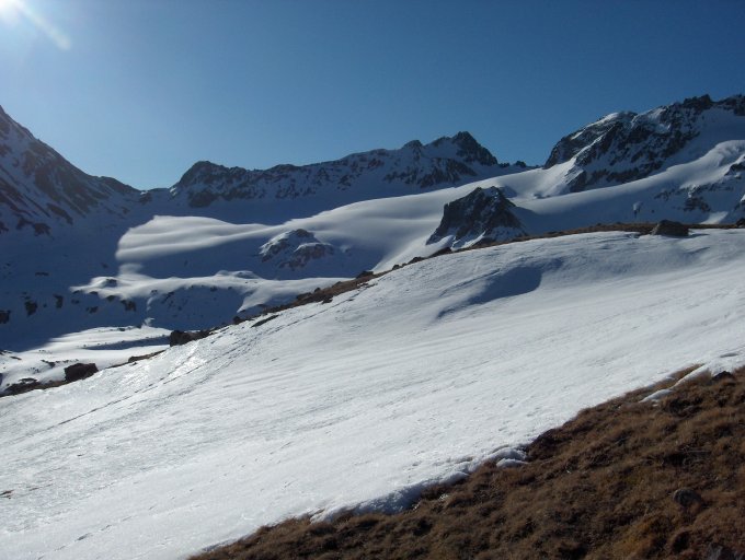 Für die W-Flanke sind Harscheisen empfehlenswert. Wer diese Flanke meistert, ist auch dem Gipfelhang gewachsen.