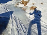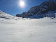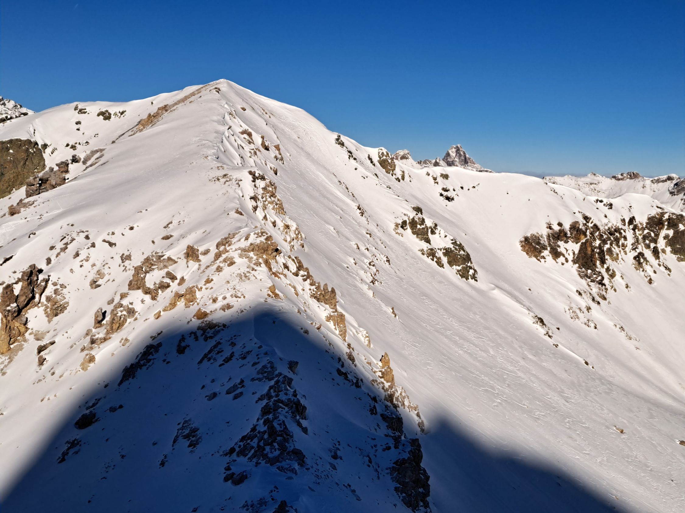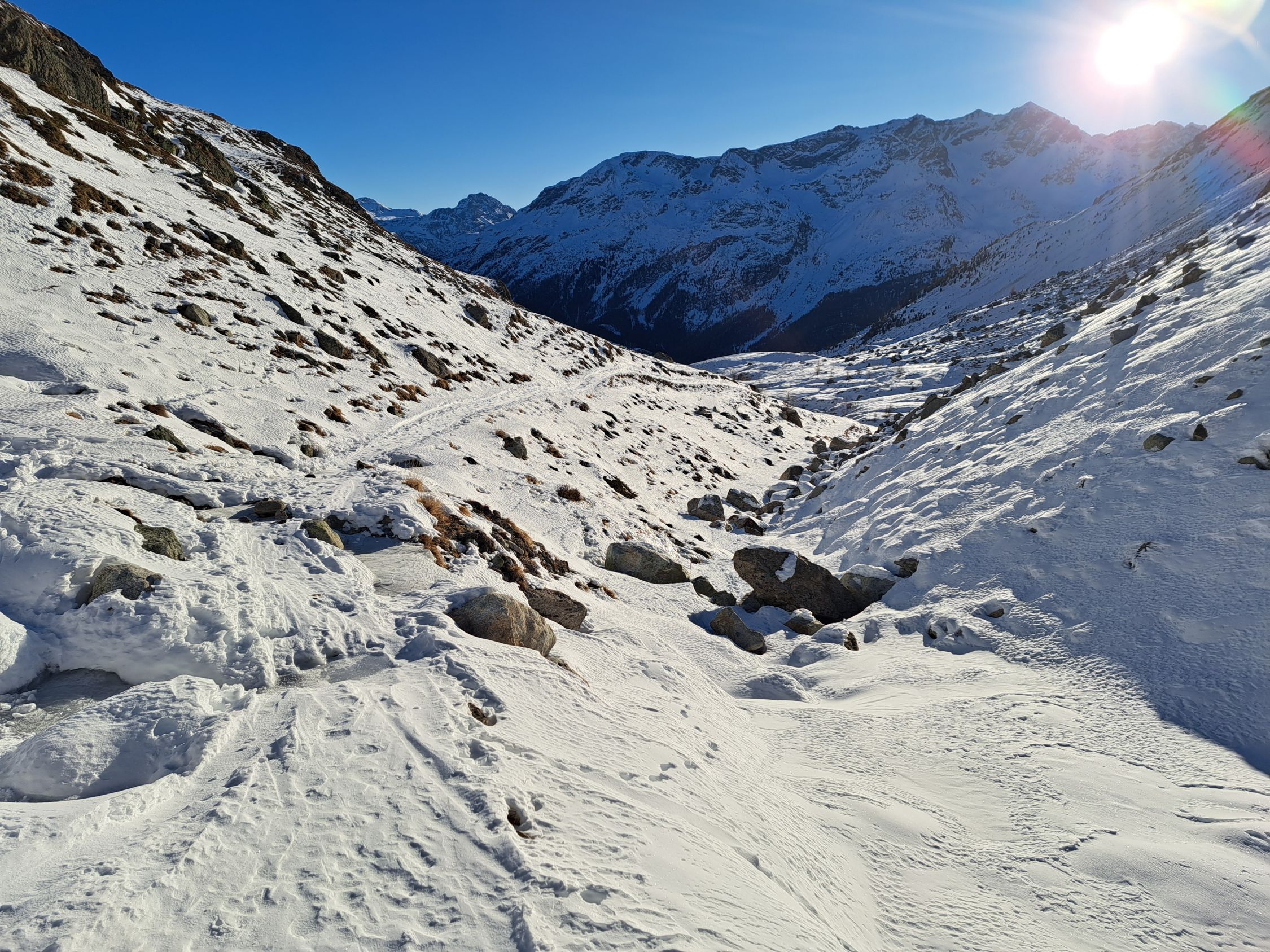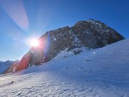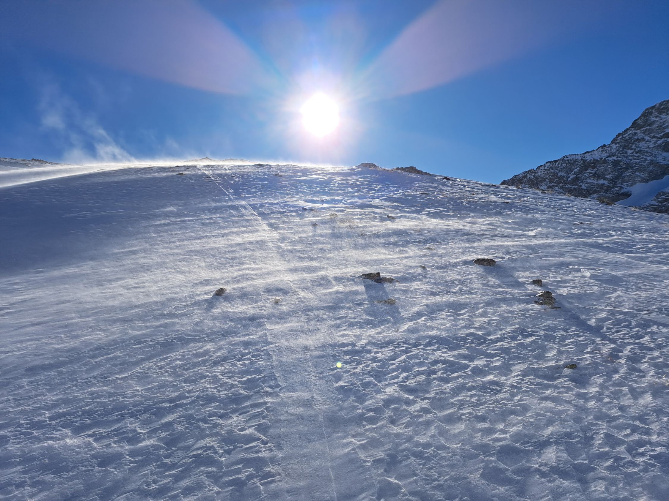 Weiter über den Südostgrat mit Ski und auch tragend zum Corn Suvretta. Abfahrt ein Stück über Nordostgrat, bis in den schönen Osthang eingefahren werden kann (je nach Verwächtungen). Vom Fusse des Hanges weiter über mässig steiles Gelände zum Pass Suvretta.