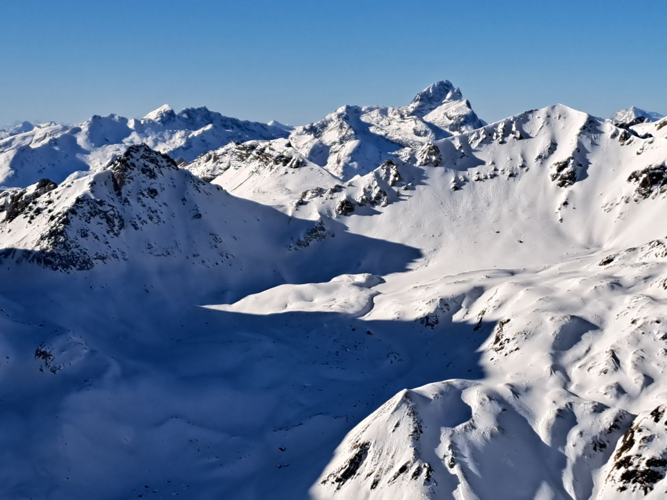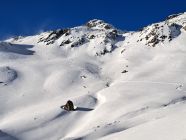 Es folgt der letzte Aufstieg (450 m) zum Piz Nair. Abfahrt bis 2934 m der Piste entlang und anschließend den Nordwesthang traversierend zur Fuorcla Schlattain. Und wieder über die Skipiste bis Marguns und weiter über Talabfahrt nach Samedan zum Skilift Survih.