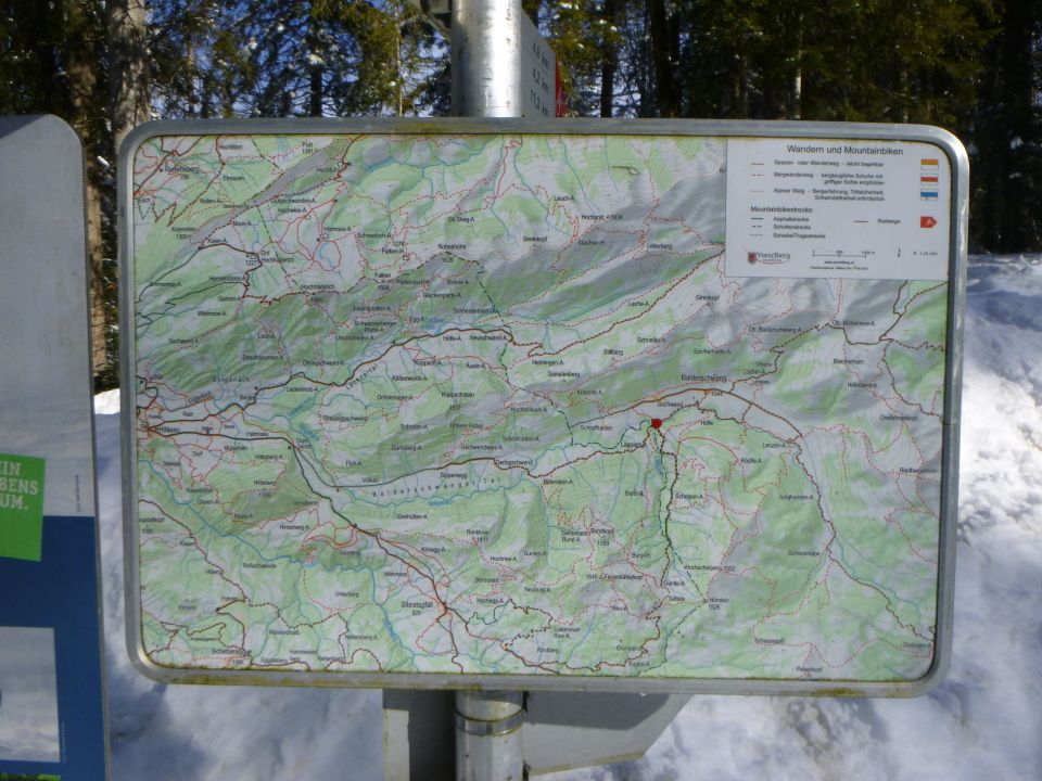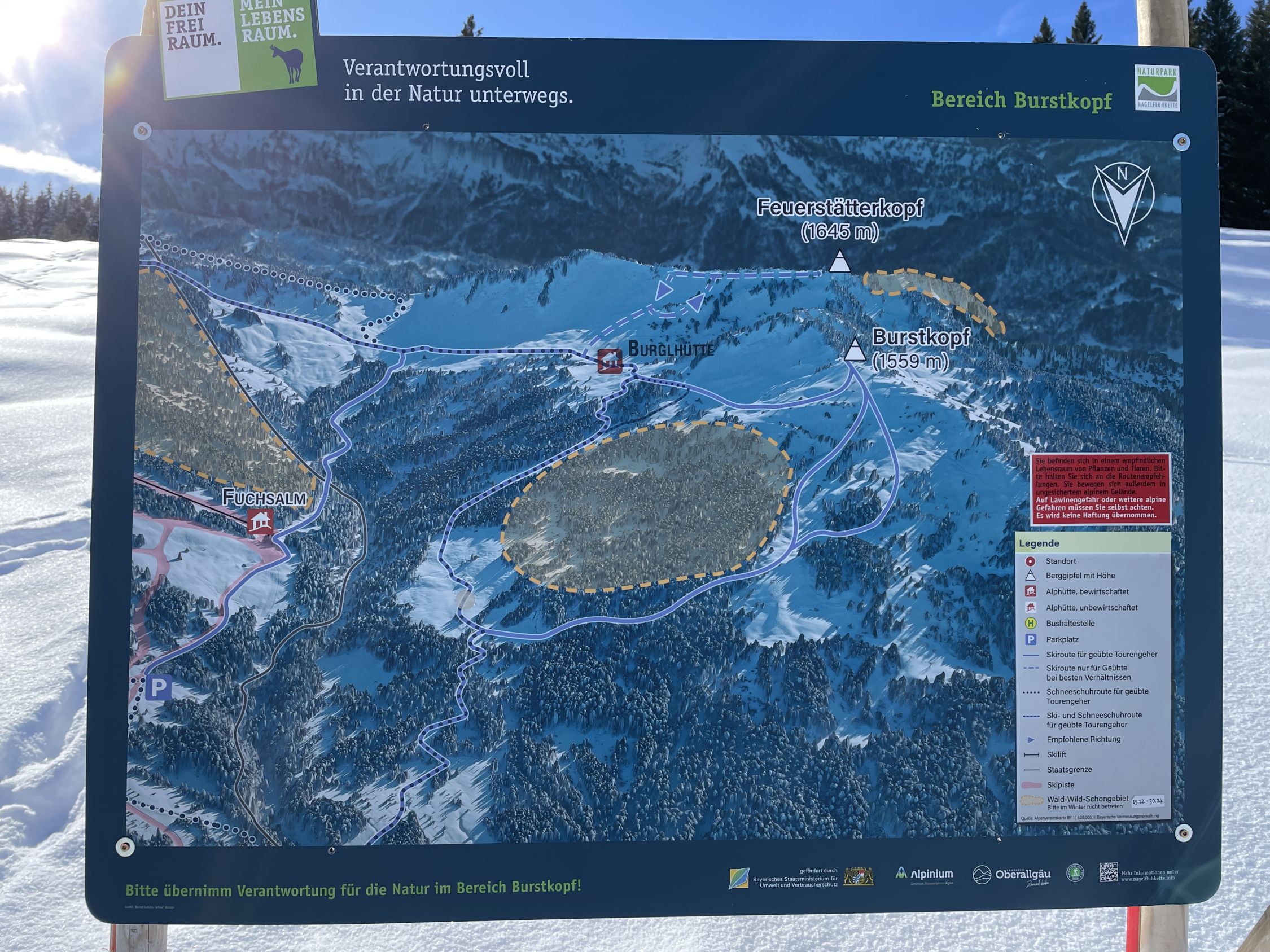 Abstieg: Hinab über die NO-Flanke hält man sich rechts bis unterhalb des namenlosen Sattels mit dem Hüttchen, wo man auf die Winterroute zur Burglhütte stößt und links einschlägt. So umgeht man das Wald-Wild-Schongebiet, wo die Auerhühner leben. Dieses kleine Gebiet sollte man in der Zeit vom 15.12. bis 30.4. nicht betreten. Man folgt dem Winterweg von der Burglhütte in nördliche Richtung durch den Wald unsteil hinunter. Die Route ist identisch mit rot-weiß signalisiertem Sommerweg. Bei der Stadelmannburstalpe auf einer Hanglichtung steht ein Wegweiser (1221 m), wo vorher eine Sommerroute zum Burstkopf westwärts abzweigt (50 min.). Man läuft nun weiter nordwärts in Richtung Lappach-Alpe auf einem Güterweg durch den Wald und beginnender Waldschneise hinunter zur Hangebene mit der Lichtensteiner Hütte (1048 m) östlich der Lappach-Alpe (45 min.). Danach trifft man auf den Güterweg Lappach-Alpen, wo man rechts einschlägt zur Brücke über Lappacherbach. Nun wandert man wieder auf bayerischem Territorium und gelangt beim Wegweiser (1007 m) mit einer Infotafel über die Routen im Gebiet Balderschwang zum Teersträßchen Lappacherweg, auf welchem man im Aufstieg lief zur Talstation der Hochschelpen-Sesselbahn. Links einschlagend nun zur sichtbaren Brücke über die Bolgenach beim Wegweiser 1003 m an Loipe, ca. 250 m westlich der Brücke an der Talstation vom Tellerlift. Unmittelbar nach der Brücke biegt man rechts ab zur Schranke. Am Wertstoffhof (1000 m) vorbei kommt man zum Teller-Schlepplift und zur breiten Piste rechts und links vom Lift. Nun kurz auf gleichem Weg hinauf zur Straße wie anfangs hierhergekommen (25 min.).