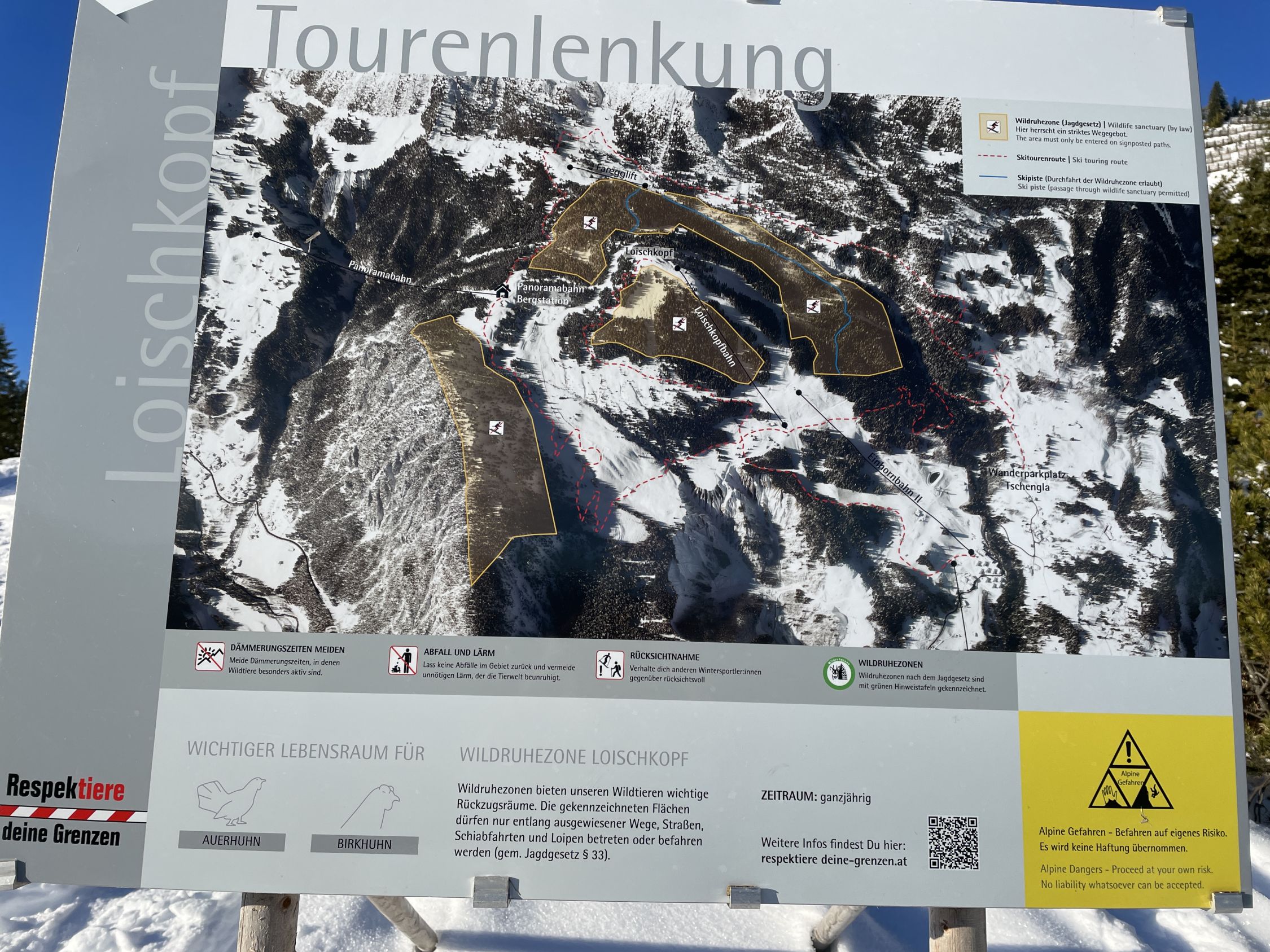 Vom Parkplatz läuft man zur nahen Talstation der Loischkopfbahn. Rechts vom Restaurant Unicorn kann man nach dem Info-Schild über die 3 Skitouren im Gebiet seine Laufgeräte anschnallen. Der Aufstieg erfolgt entsprechend den mit wenigen ockerfarbenen Schildern signalisierten Loischkopf-Tour (Nr. 1.1.). Rechts am Kinderskiplatz vorbei beginnt man links von blau markierter Skipste mit Nr. 23 über eine Schneise durch den Wald südostwärts unsteil hinaufzulaufen, um dann in einer Rechtskurve einen Forstweg zu überqueren und auf die Piste Nr. 23 zu stoßen. Südwärts erreicht man dann den Links-Abzweig der Burtscha-Tour (Skipiste Nr. 21), wo man auf dem Rückweg wieder hierherkommt. Rechtshaltend links von der Skipiste Nr. 23 bleibend passiert man auf einer schrägen und lichten Anhöhe links die Hütte vom Skiclub Bürs und rechts die 1962 gebaute Waiblinger Hütte (Hausnr. Burtscha 1, 1410 m, 50 min.). Hinter ihr sieht man im Westen die Mittelstation der 1,7 km langen Loischkopfbahn. Westwärts nun linksdrehend am Bergrestaurant Fuchsbau (1420 m) beim Antennen-Gittermast links vorbei folgt man nun zur blauen Skipiste Nr. 26. Diese Route mit Nr. 1.1 (Loischkopf-Tour) ist ausgeschildert mit ockerfarbenen Schildern. In südwestliche Richtung folgt man der blau markierten Piste Nr. 26 bis man rechterhand oben die Lawinenverbauungen in ehemaliger Lawinenschneise vom Berg sieht. Ein kleines rundes Schild rechterhand weist auf die Wildruhezone hin, wo ganzjährig nach dem Jagdgesetz ein Betretungsverbot herrscht. Nach der Infotafel über die Tourenlenkung in diesem Gebiet an rechter Seite der Piste weist das ockerfarbene Schild der Loischkopf-Tour 1.1 nach rechts in den Wald hinein. Hier verlässt man die Skipiste Nr. 26 (1 Std.). Durch eine unscheinbare Waldschneise steigt man maximal 22° steil auf und trifft auf einen Forstweg. Dort schlägt man rechts ein, verlässt aber nach 8 m diesen wieder nach links. Der folgende Waldaufstieg ist etwas unübersichtlich und kann ggfs. Schneearm sein. Bei einer wieder sichtbaren Waldschneise trifft man wieder auf das Schildchen zur Wildruhezone und das Routenschild 1.1 mit Pfeil nach links. Vor dem Wildruhegebiet biegt man scharf links ab und folgt der zuwachsenden Schneise aufwärts in südwestliche Richtung bis man die rote Skipiste Nr. 21 linkerhand tangiert. Nach rechts abbiegend gelangt man nordwärts zur beginnenden lichten Kuppe und kommt links an oberster dreieckiger Stützverbauung aus Holz vorbei. Nun linkerhand hinauf zur flachen Graskuppe, von wo man ungeahnte Rundum-Panorama-Aussicht hat. Dort stehen eine Panorama-Tafel, sowie 2 Bänke. Von hier sieht man bis zum Bodensee im Norden, das Große Walsertal im Osten, rechts davon das Klostertal vorm Arlberg und zu den südlichen Gipfeln des Montafons mit markanter Zimba, sowie im Süden die Staumauer vom Lünersee, der Schesaplana und den Oberzalimkopf rechts dahinter, wie auch die Kirchlispitzen, den Seekopf und Zirmenkopf rechts davon. Im Nordwesten blickt man auf nahen Tuklar, Alpilakopf, Schillerkopf und Mondspitze (v.l.n.r.). Ein altes Holzkreuz steht zwischen dem Gipfel und der 1800 m hohen Bergstation der Loischkopfbahn (55 min.).