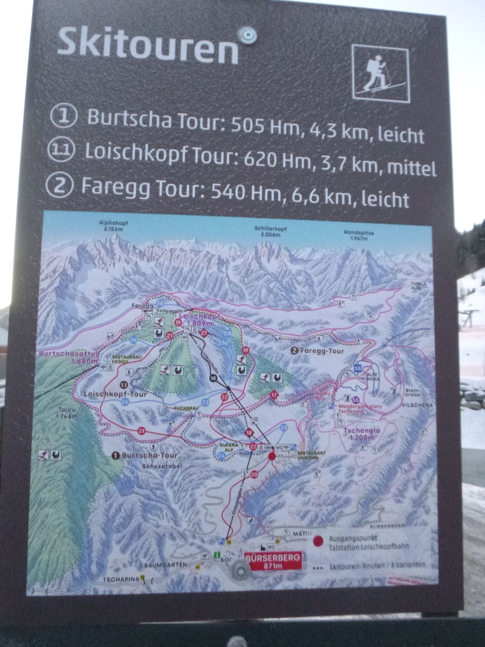 Abstieg: Man wandert am Kreuz vorbei hinunter zur nahen Bergstation der Einseil-Umlaufbahn mit der 10-Personen-Gondel (1800 m). Dort folgt man scharf linksherum der blau gekennzeichneten Skipste Nr. 26 und dem Winterwanderweg hinunter in südliche Richtung bis zum Burtschasattel. Dort steht der Hauptwegweiser-Mast (1665 m) mit einer Vielzahl von Schildern (45 min.). Links von der Bergstation der Gondel-Luftseilbahn Panoramabahn (1680 m), die vom Brandnertal hierherfährt, und rechts vom Bergrestaurant Frööd folgt man der Burtscha-Tour mit Nr. 1, einer Kombination aus Skipiste Nr. 26 und dem Winterwanderweg, bis zur Kreuzung mit der rot markierten Skipiste Nr. 21. Dort biegt man rechts ab, verlässt die Skipiste Nr. 26 und wandert der Skipiste 21 folgend ostwärts über freies, flaches Hanggelände rechts an einer Hütte vorbei und die Kehren eines Güterweges abkürzend nach linksdrehend zum Hüttchen „Almrausch“ (Hausnr. Burtscha 12, 1513 m). Weiter nach rechts von der Skipiste Nr. 21 abbiegend zum Wegweiser südlich naher Burtscha-Alpe (1448 m) beim Holzkreuz von 2020 (40 min.). Ab dort folgt man dem ockerfarbenen Schild und des Winterwanderweges Burtscha-Tour 1 folgend auf der Schotterpiste in nördliche Richtung oberhalb der Sandabbau-Schlucht vom Kieswerk Zechkies zu einer Brücke über die Schesa in einer Rechtskurve, wo man wieder auf die Skipiste 21 trifft. Vorbei an einer Hütte nach der Brücke passiert man die Tschengla-Hütte der Naturfreunde Bludenz (Hausnr. Burtscha 9; 1500 m), die unterhalb rechter Wegseite steht. Man folgt der Piste 21 am Holzhüttchen mit Hausnr. Burtscha 8 rechts vorbei bis man wieder auf die blaue Skipiste Nr. 23 trifft (30 min.). Ab hier entweder auf gleichem Weg zurück, wie aufgestiegen. Oder man folgt der roten Skipiste weiter etwas links hinab bis zur Rufana-Alp (1230 m) rechts von der Gondelseilbahn und von dort hinab zur nahen Talstation (20 min.).
