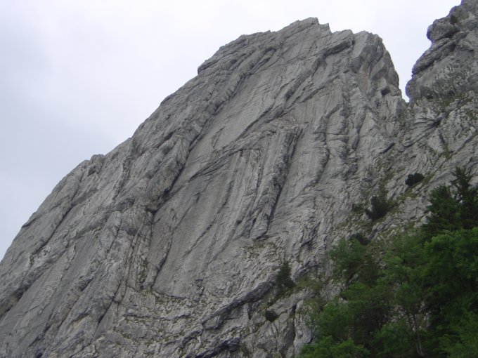 Weitere Seillänge hoch, unter dem Dach querend zu einem bequemen Stand. Weiter 2 Seillängen hoch, wobei die 2. nach ca der Hälfte aus der Verschneidung nach links führt. Weiter erst nach links, wieder rechts und gerade hoch nochmals links und schräg rechts hoch zu Stand. Noch eine weitere am Schluss anstrengende Seillänge gerade hoch. Noch eine letzte leichte direkt zum Gipfelkreuz.
