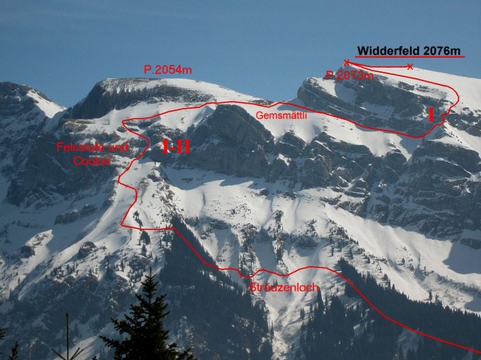Von der Busendstation wandert man entlang eines Fahrsträsschens sanft ins hintere Eigental, dabei hat man die Nordabstürze des Widderfelds im Blick. Wenn man den Widderfeld hinter seinen Felsen verschwindet und das Mittaggüpfi schön sieht, ist man bei der Brücke P.1095m beim urtümlichen Schwändeliwald. Hier nimmt man den Bergweg der zum ehemaligen Pilatussee abzweigt. Beim P.1324m überwindet man gesichert eine erste Felsstufe, anschliessend wird das Gelände bald offener bis man zur kleinen Ebene Bründelen (P.1434m) kommt. Der Bergwanderweg geht hier nach rechts weiter, zum Widderfeld muss man allerdings nach links über den nur wenig erkennbaren Bergweg weiterwandern. Man kommt so zu einer kleinen Hütte mit Sitzbank und Tisch, quert danach einen Talkessel und kommt beim P.1592m auf einen bewaldeten Grat. Durch den lichtbewaldeten Grat geht's nun weiter bergauf bis ins Sträuzenloch. Das Sträuzenloch sind drei parallele Sturzrinnen die überquert werden müssen (immer noch Pfadspur). Nach den Rinnen folgt nochmals ein kleines Wäldchen das durchquert wird und schon sieht man den beginn eines markannten Grasgrates. Auf dem Grat geht es nun steil 180 Höhenmeter direkt bis zur Felsstufe hoch - zu meiner Überraschung ist der Einstieg mit einem gelben Pfeil markiert. Man klettert dort etwa 10m (I-II) nach oben und erspäht dann schon die nächste Markierung: ein gelber Punkt. Hier geht man in einem kleinen Couloir unter dem Felsen (bei mir im Schnee) weiter 15m weiter nach oben. Danach wird das Gelände wieder einfach, eine Felsstufe wird ansteigend nach links überwunden und schon steht man oberhalb des Felsriegels. Über eine Grasflanke steigt man weiter (jetzt nach rechts) in die Lücke Gemsmättli unter der Widderfeld Ostwand. Um auf den Gipfel zu gelangen muss man nach Westen unter die Widderfeld Gipfelnordwand zu einer letzten Felsstufe queren. Über diese Felsstufe gelangt man mässig ausgesetzt (I; Drahtseile) aufs Gipfelplateau. Über den Vorgipfel mit dem lustigen Kreuz wird der Gipfel nun wandernd erreicht.