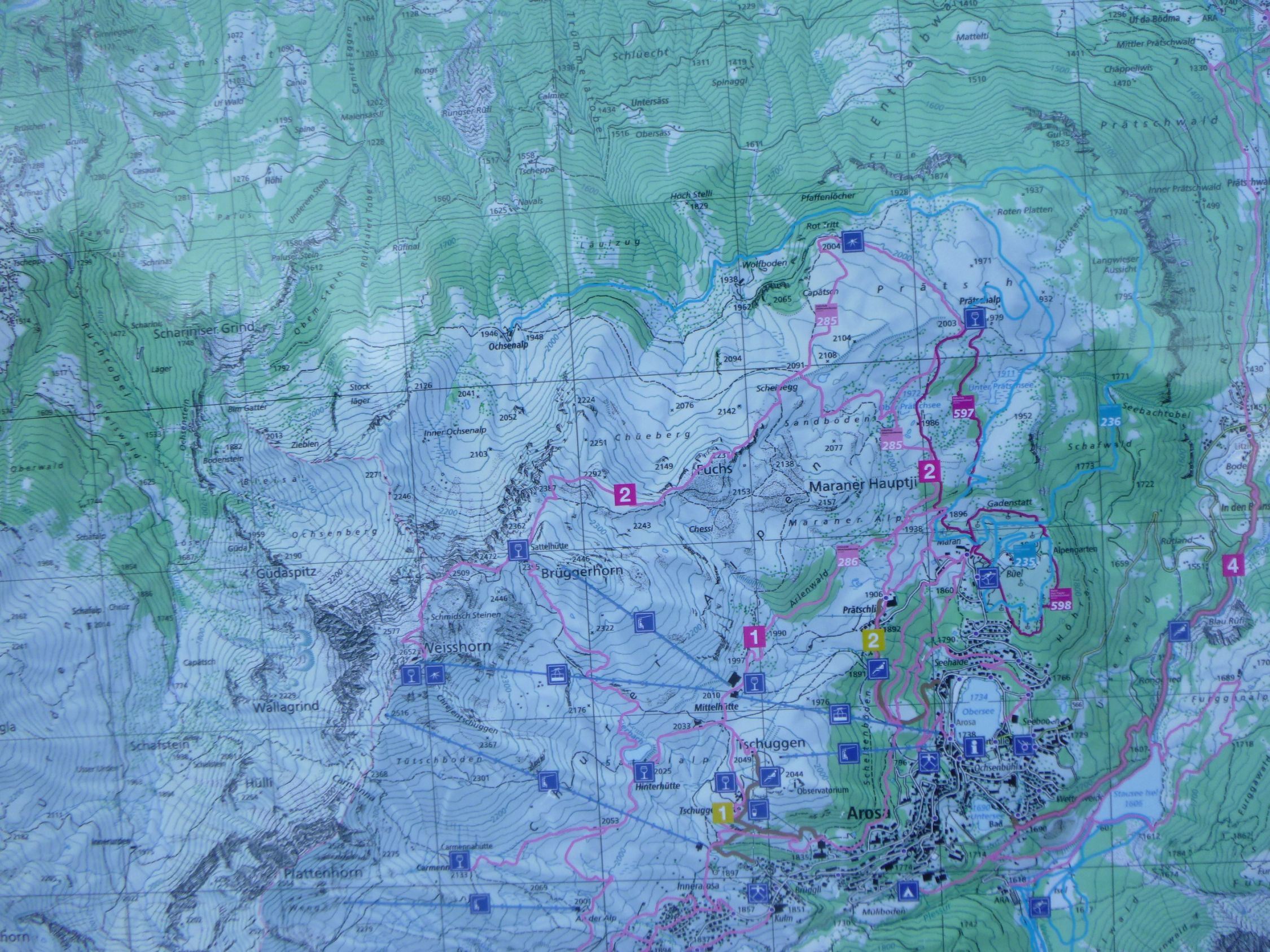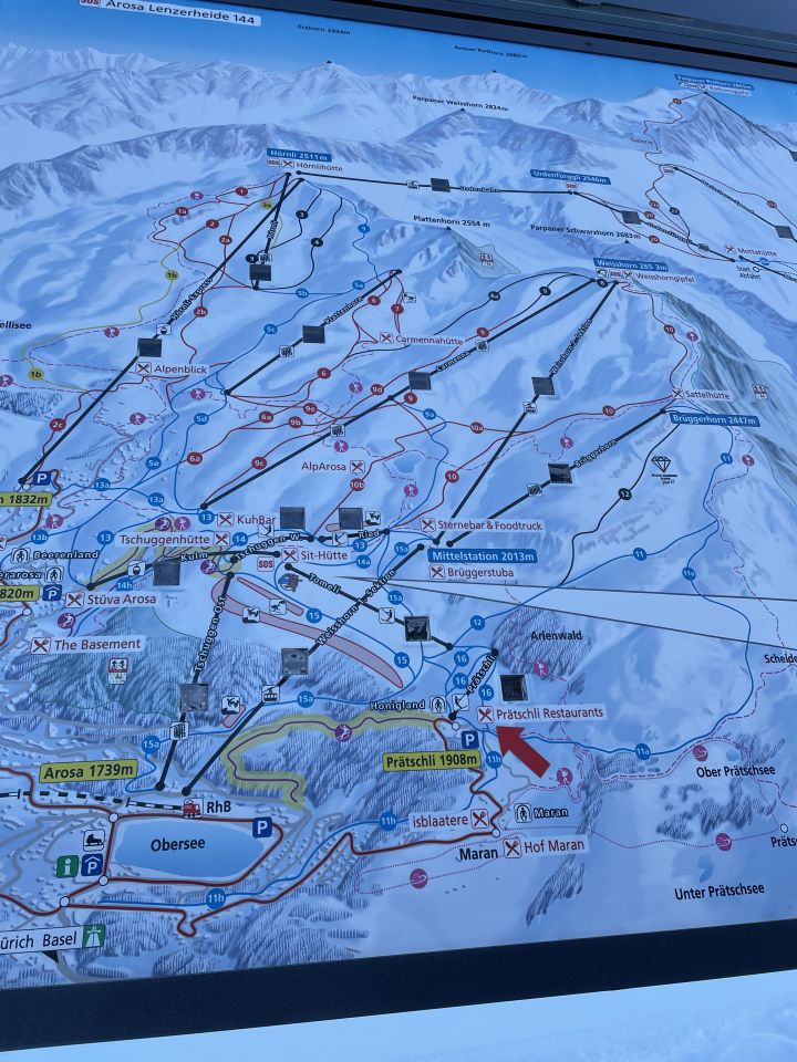Prätschli – P 1938 – Under Sandboda – Prätschalp – Rot Tritt – Scheidegg – Fuggs – EWA26 – Brüggerhorn – Sattelhütte – Aroser Weisshorn – Sattelhütte – Piste 10 – Mittler Hütta – Piste 15a - Prätschli