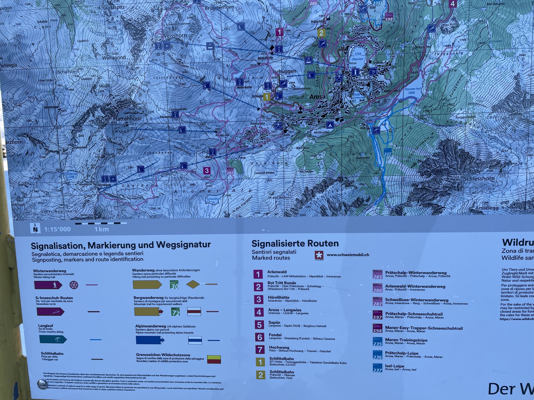 Nach der Ausfahrt Chur-Süd von der Rheintal-Autobahn A13 biegt man ab und fährt durch Chur ostwärts Richtung Arosa. Nach Umfahrung der Altstadt (676 m) biegt man links ab zur Brücke über die Plessur und unmittelbar dahinter wieder rechts in die Arosastraße. Von nun an geht’s bergauf auf der 29 km langen Straße Nr. 566 mit 360 Kurven. Über Maladers (916 m), durch den Calfreisen-Tunnel nach Castiel (1174 m) und nach dem Clasaurer Tunnel erreicht man St. Peter (1259 m). Weiter über Langwies (1377 m) bis zum Ortseingang von Arosa (1729 m). Danach biegt man die erste Straße rechts ab und fährt die Maraner Straße nordwärts hinauf zum Hotel „Hof Maran“. Vor diesem beginnt links die Genderstraße. Auf dieser nun westwärts weiter bergauf bis zu deren Ende an der Bus-Wendeschleife beim Hotel und Restaurant Prätschli (1904 m). An der Nordseite der Wendeschleife gibt es ca. 15 öffentliche, kostenpflichtige Parkplätze neben dem Privatparkplatz für dortige Gäste. Dort steht eine große Tafel mit dem Pistenplan. In dieser sind auch die präparierten Winterwanderwege, sowie die (meist) gespurten Schneeschuh-Routen eingezeichnet. Alternativ: Von Chur 25 km mit der Schmalspurbahn nach Arosa (1 Std.). Von dort dann 160 hm zu Fuß hinauf zu den oberen Häusern von Maran.