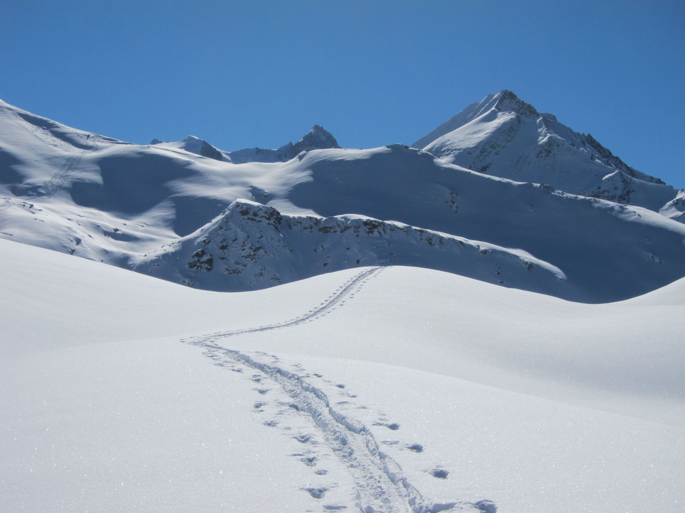 Achtung: Der südseitige Abstieg vom Pass bewegt sich wohl nur bis zur Alp Tsahèlett ausserhalb nennenswerter Lawinengefahr. Weiter unten hat es steile Hänge, die - im Unterschied zur Nordseite - nicht für Anfänger bzw. Nicht-Lawinenprofis geeignet sind.