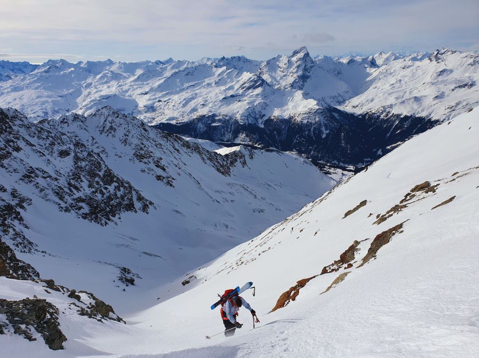 Aufstieg: Sur-Cuorts-Tellers Davains-Südcouloir-E-Flanke-Scharte (Skidepot)-N-Grat.