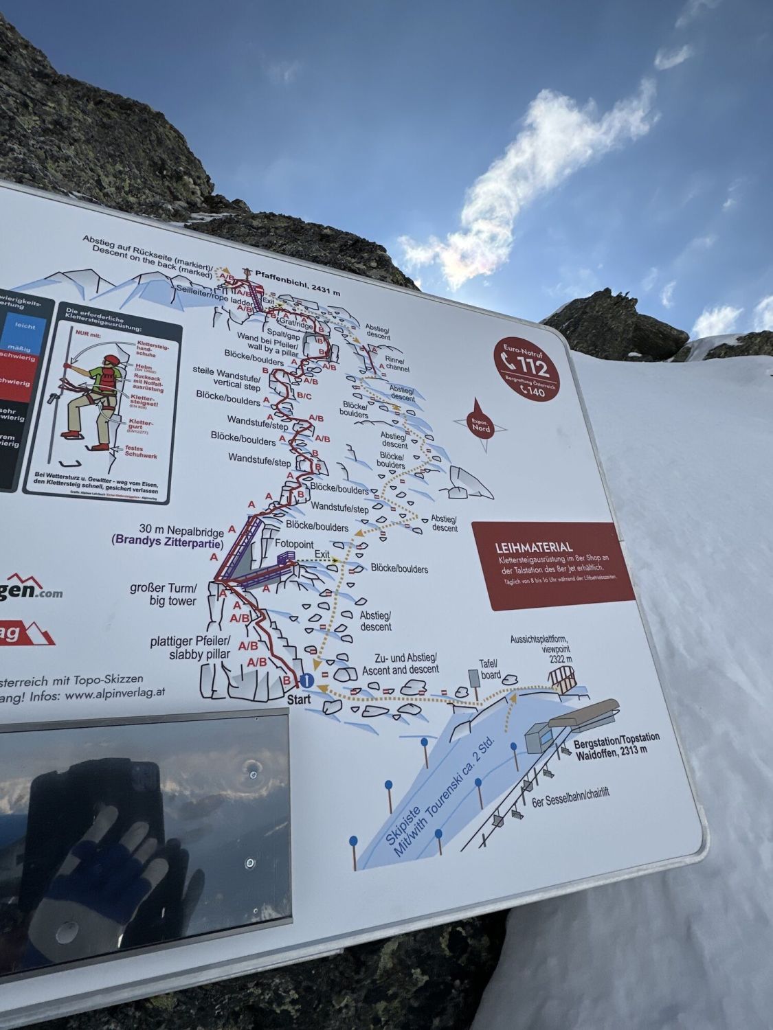 Von der Bergstation des „8er Jet“ läuft man links die Piste 13 hinauf welche in die blau gekennzeichnete Piste 11a mündet. Auf dieser in rechter Kurve hinauf zu sichtbaren Bergstation des 6er Sessellifts „Waidoffen“ (2313 m) etwas unterhalb vom Bergsattel (35 min.). Am Sattel bei der kleinen westseitigen Aussichtskanzel mit Fernrohr kann man sein KS-Geschirr anziehen (2322 m). Man läuft zum internationalen Wegweiser, der aus Skiern als Schilderbaum zusammengebaut wurde. Dann hinauf zu 3 Blocksteinen vorbei, wo man seine Laufgeräte deponieren kann. Von hier nun zur nahen kleinen Felswand unterhalb des markanten Felszahns hoch (2353 m). Rechts vom Einstieg erkennt man die Info-Tafel über den Klettersteig (10 min.).