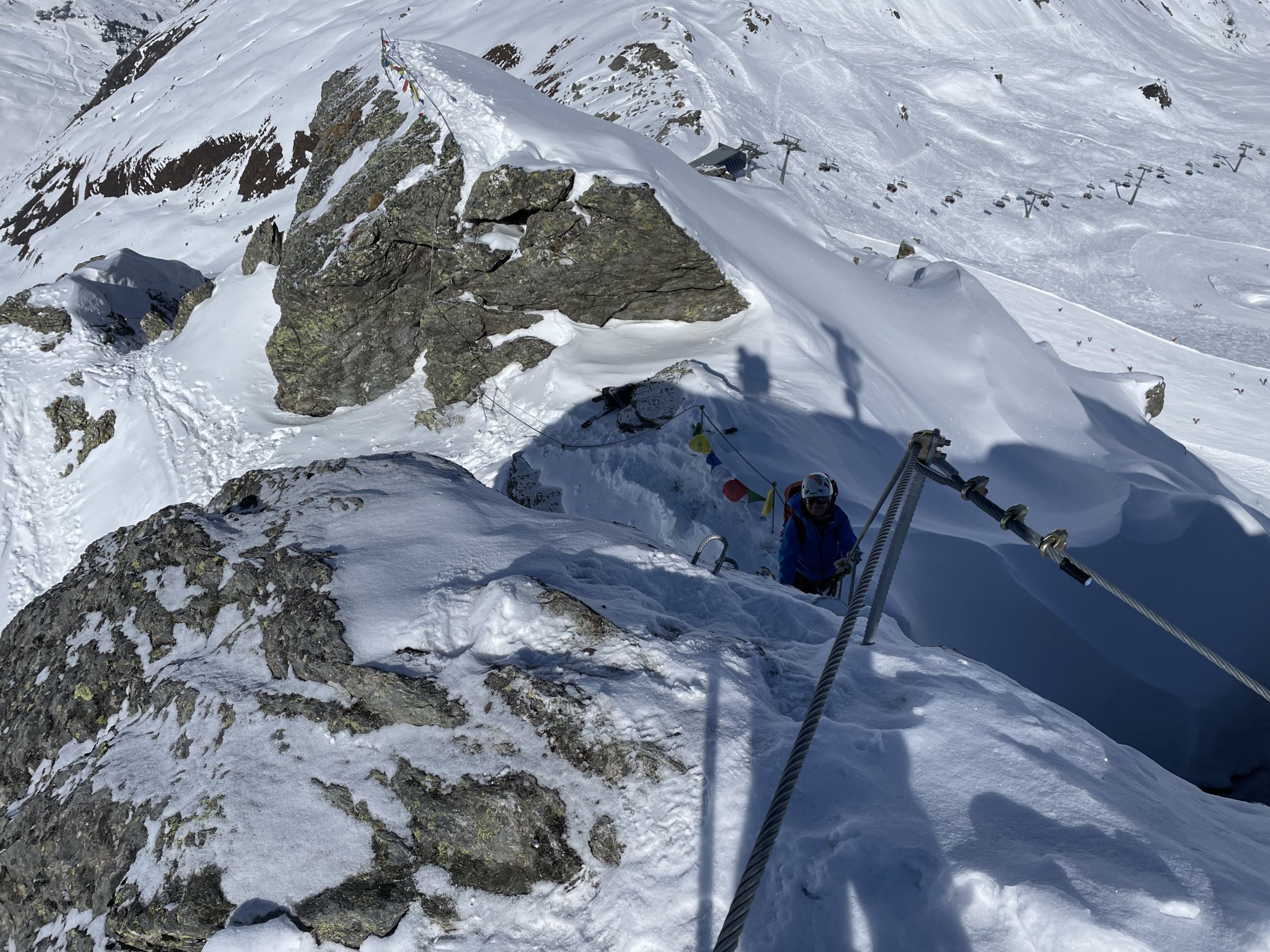 Für den Winterklettersteig wurde im September 2025 vom Team Rohrmoser / Brandacher der Fa. Klettersteigbau-HZI 350 m Stahlseil mit 14 mm Durchmesser verbaut sowie Fixanker und schmale Trittbügel. Das Seil führt über die Blocksteine des ca. 260 m langen NW-Grats. Begangen wird der Steig nur von unten nach oben entweder mit Skischuhen (Skifahrer), oder schweren Bergschuhen (Schneeschuhläufer). Steigeisen sollte man ggfs. dabei haben bei vereisten Passagen. Nach dem Einstieg folgt man nach links dem Seil auf natürlichen Tritten und meist auf schmal gebogenen Trittbügeln hinauf zur Spitze des Felszahns. Nach rechts gibt es über eine kurze Hängebrücke einen Notausstieg, der zu naher Normalroute (Abstiegsroute) führt. Von dort kann man Fotos machen von der 4-Seil-Hängebrücke. Schmale Riffl-Bleche zwischen den beiden unteren Seilen bilden den Laufsteg der 28 m langen Nepalbrücke. Diese endet an einem Granitblock unterhalb einer Lawinenverbauung. Rechts an diesem Metallgitter vorbei quert man diagonal zu den Blocksteinen des Grats. Danach wechselt man die Seilseite beim Klettern über weitere Granitstufe. An rechter Seite sieht man unterhalb auf den Normalweg. Nach einem kleinen Felssattel quert man diagonal nach rechts weitere Granitstufe und gelangt zum nächsten kleinen Felswandl, das an einem 3 m tiefen Spalt endet, welchen man mit einem Schritt zum Wandbügel überquert. Durch kurze Rinne letzter Wandstufe gelangt man zum horizontalen Grat. Über diesen kurz zu seinem Ende oberhalb eines Felssattels an rechter Seite. Zum kleinen Gipfelkopf hinauf steigt man über 20 m hohe Seilleiter (1 Std.). Oben ist nicht viel Platz. Anlässlich des 200-jährigen Bestehens der Musikkapelle Fügen wurde im Jahr 2025 das Gipfelkreuz mit der Harfe aus Holz dort aufgestellt. An seinem Schaft befindet sich der „Briefkasten“ für das Gipfelbuch. Vom Gipfel hat man Rundumsicht auf den Zillertaler Hauptkamm und erblickt den Hintertuxer Gletscher, Großvenediger und Großglockner, sowie den Wilden Kaiser im Norden und die Zugspitze im Nordwesten.