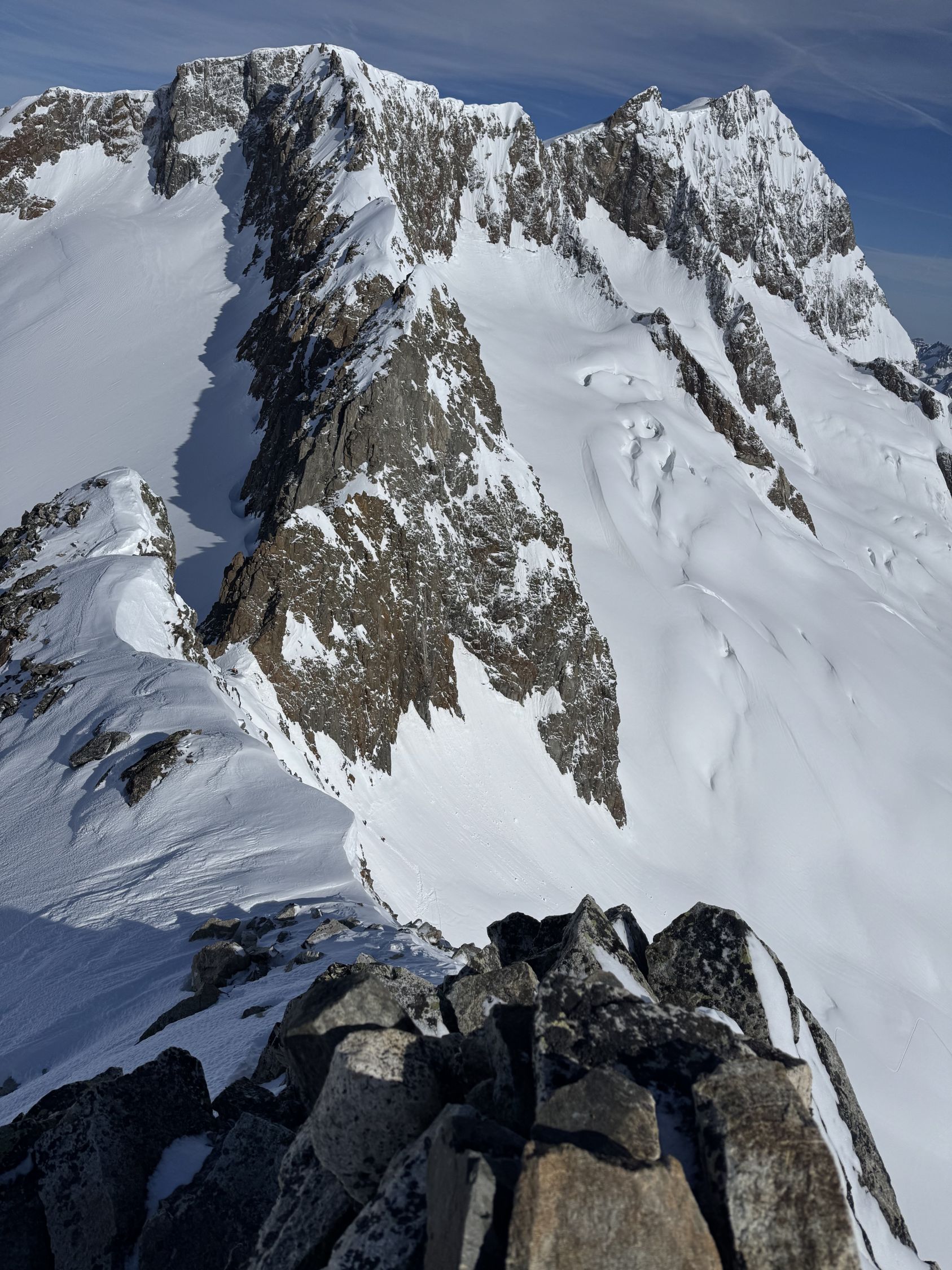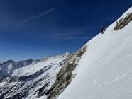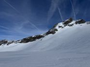 Vom Skidepot mehr oder weniger in der Fall-Linie des Gipfels hoch, am Schluss mehr nach rechts um auf den Ostgrat zu gelangen. Flanke im unteren Teil min. 45 Grad, im oberen Teil wenig flacher. Vom Ostgrat den Gipfel nordseitig exponiert auf einem kleinen Band umgehen und am Schluss in der West-Seite ohne Schwierigkeiten hoch.