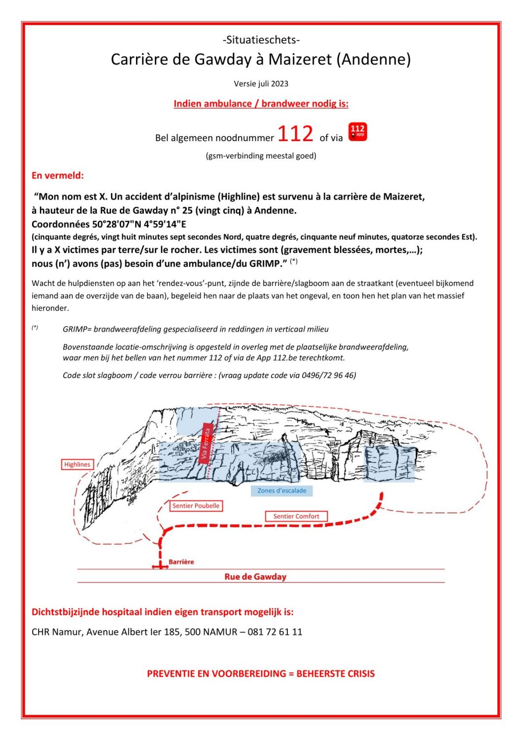 Von Westen (Namur) auf der N 90 entlang dem Südufer der La Meuse (Maas) in Richtung Maizeret. Wer von Norden (Autobahn A 15) anreist, fährt ab Ausfahrt Nr. 10a auf der N942 südwärts nach Namêche zur Brücke über die Maas. Am Ende der Brücke biegt man links ab und fährt westwärts auf der Rue de Gawday (N90) bis zur Km-Marke 82 m. An rechter Straßenseite gibt es ab der Apotheke „Vet33“ einen Parkierungsstreifen (86 m).