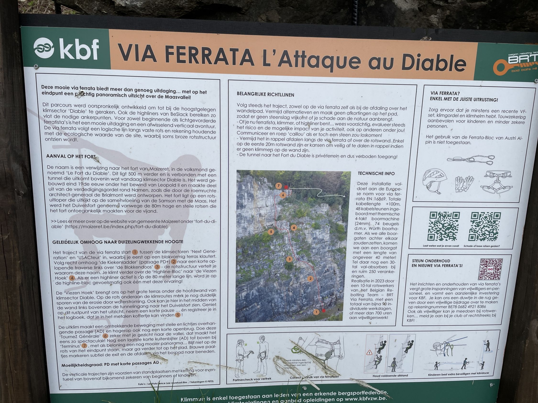 Der Einstieg „next generation“ in den 100 m langen Klettersteig befindet sich im mittleren Bereich der Steinbruchwand. Im Jahr 2023 hat man dort 74 Eisenbügel eingebohrt und 250 Seilanker. Es gibt 7 sehr kurze bezeichnete Abschnitte. Der zweite führt senkrecht über den grauen rissigen Kalkstein („de Kiekenladder“). Im dritten Sektor „de Blokkendoos“ klettert man etwas nach rechts hinauf zum „de Highline-bloc“. Auf dem Absatz dann nach links zum Absatz „Viezen Hoek“. Von dort dann direkt hoch zur Rechtsquerung („TourneZ Générale“). Schließlich im Riss („Terminus“) hinauf zum oberen Ende (40 min.).