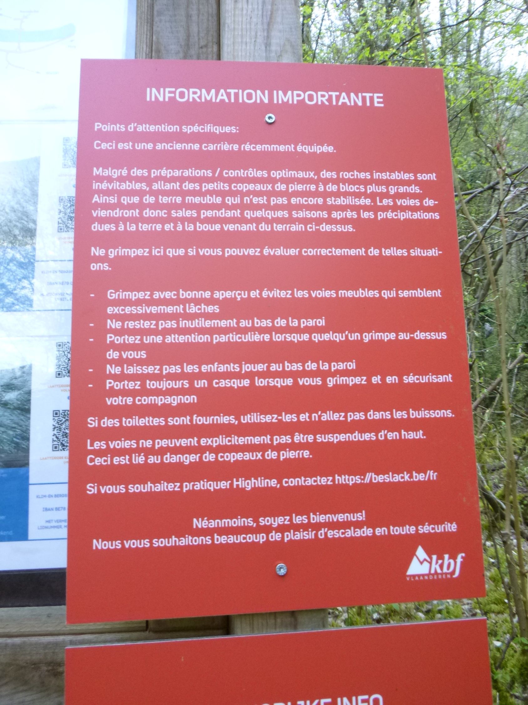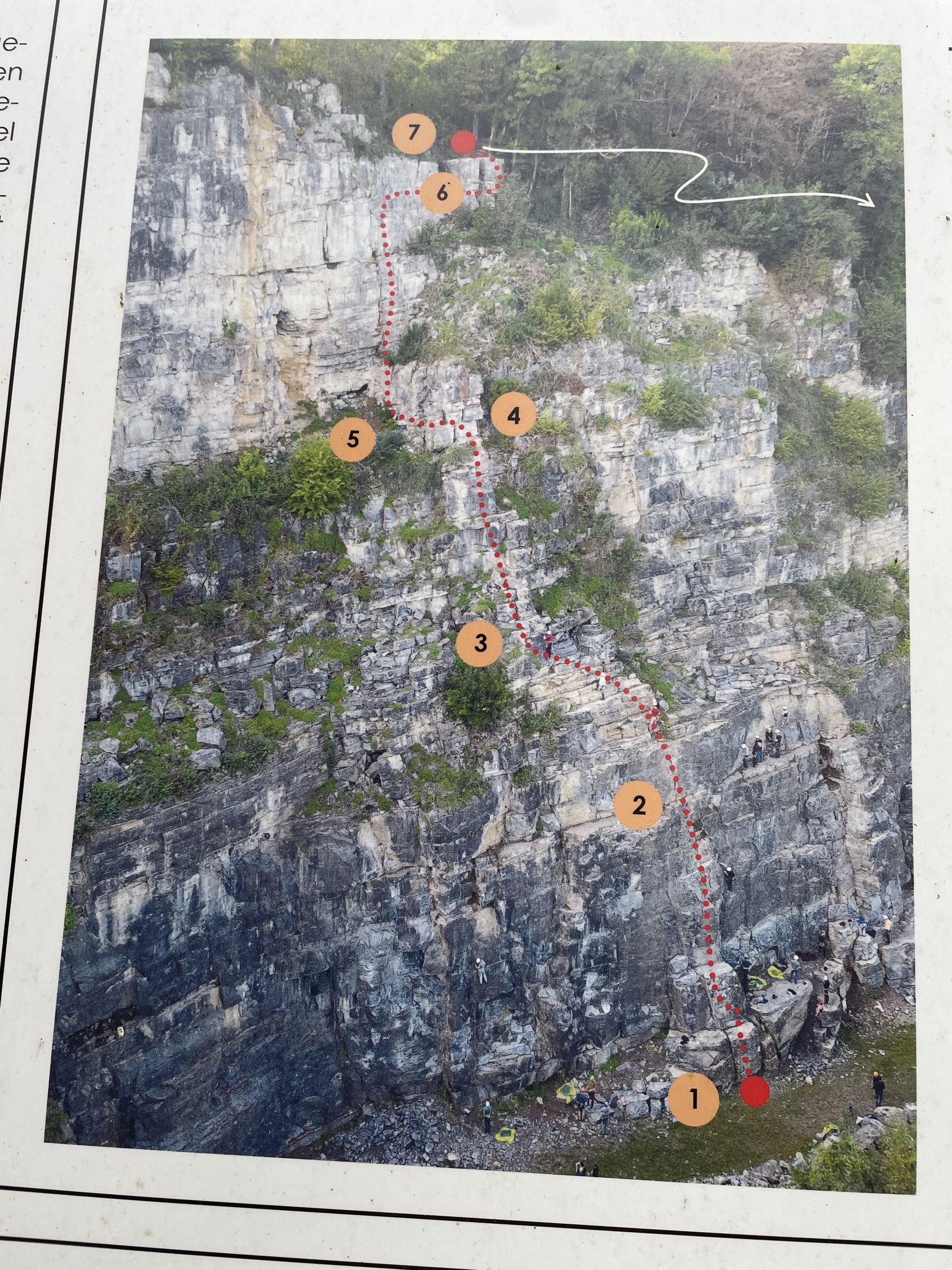 Man überquert die Straße zur Kilometermarke an der Südseite. Dort gibt es einen Einfahrt zu ehemaligem Steinbruch, der von der Klim-en Bergsport Federatie (KBF) zum Klettergarten umfunktioniert wurde. Vorbei an der rot-weißen Schranke folgt man dem Forstweg erst in westliche Richtung zur Rechtskehre, wo man denn nun sichtbaren Nordabbrüche sieht (5 min.).