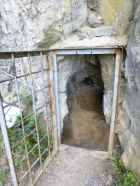 Gegenüber vom Grasplatz befindet sich an linker Seite der Felswand der Einstieg durch einen kurzen Stolleneingang, in dem auch das Stahlseil beginnt (1 min.). Der Stolleneingang hat eine Gittertür. Diese sollte offen sein. Links vom Eingang sieht man am Boden eine alte Info-Tafel zum Klettersteig.