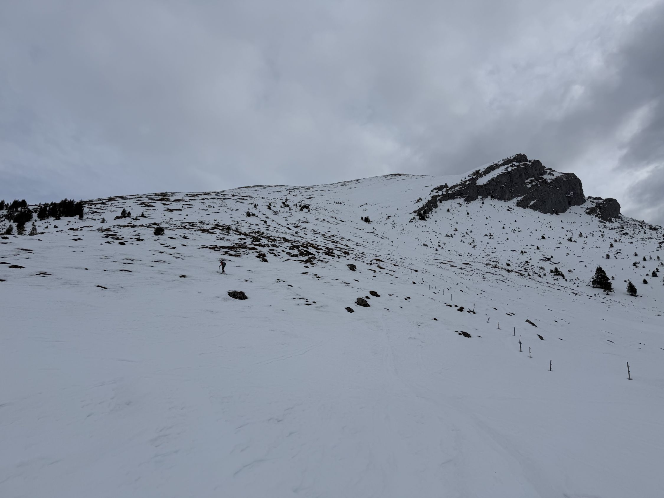 Vom Riedli über die schmale Kunstschnee-Piste bis zur Bergstation des Sessellifts. Der Sessellift fuhr heute nicht. Nach Nüegg flach auf der Strasse (wohl bald ohne Schnee) zur Talstation vom (ehemaligen?) Homad-Skilift. Ab hier durchgehende Schneedecke. Weiter zur Punkt 1737m, dann via Weg zur Alp Wirie 1855m. Dann über den Rücken dem Gipfel entgegen.