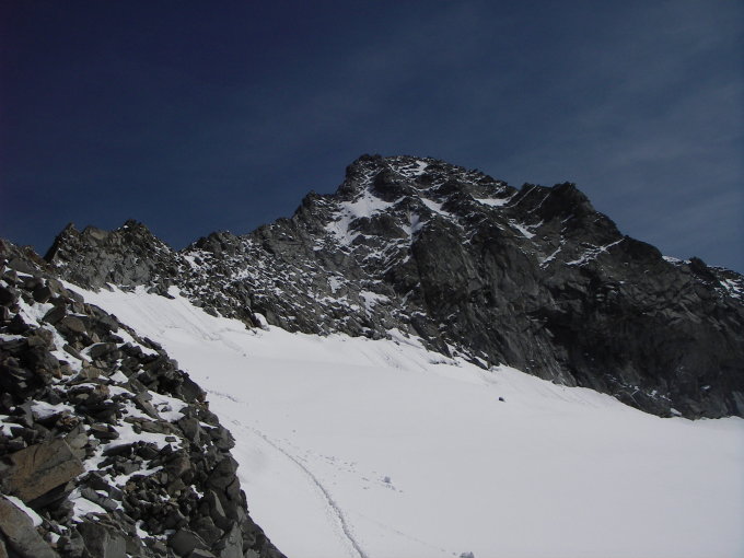 Von der Gießener Hütte auf gut markierten Weg zur Winkelscharte. Über Blockwerk in die Scharte vor dem Trippkees und zur Grathöhe. Kurzer Abstieg (1+) zum Gletscher und an dessem Rand (Achtung Randkluft) zu den Felsen. Der Detmolder Grat ist fast durchgehend bis zum Gipfel mit Drahtseilen versichert (2006 erneuert).