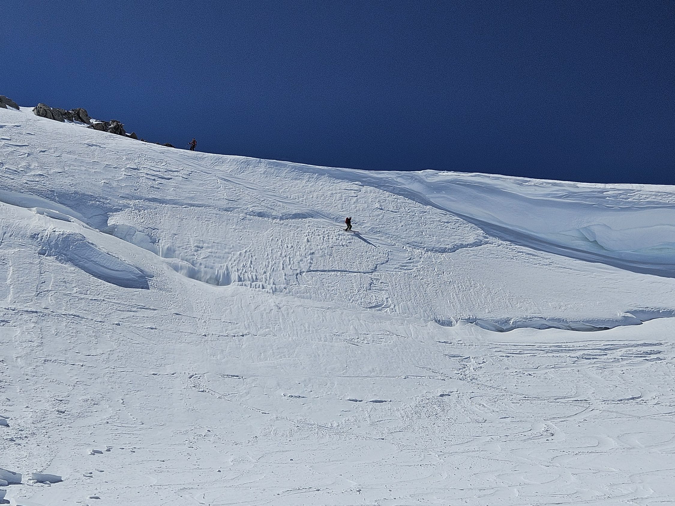 Das war unser Übergang von der Refuge Albert 1er zur Cabane du Trient, auf der wir den Gipfel Petit Fourche mitnahmen. 60 hm unterhalb legten wir ein Skidepot an und gingen mit Steigeisen und leichter Kletterei auf den Gipfel.