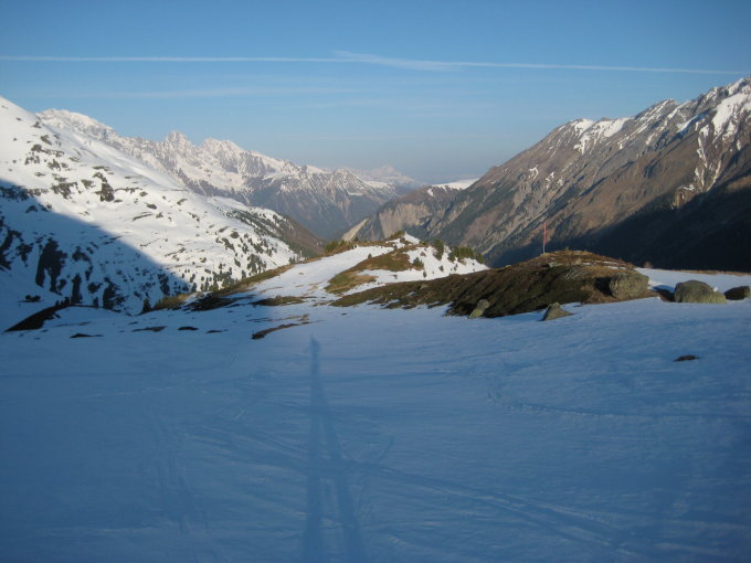 Ab Hütte (2630 m) nach Süden östlich P 2876 vorbei Richtung Porta d'Es-cha. Vor den Sattel nach Westen zum Skidepot auf ca. 3250 m.