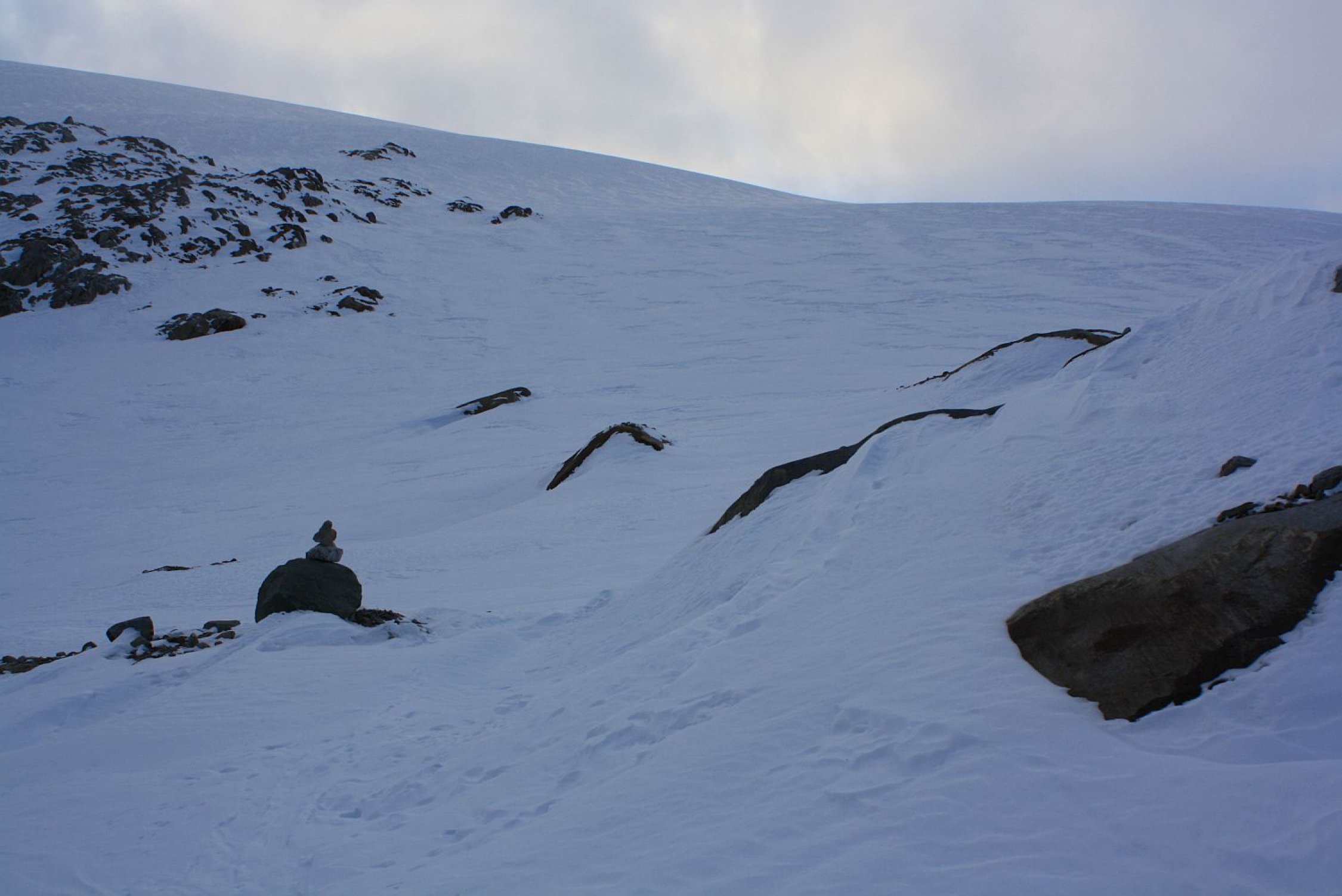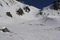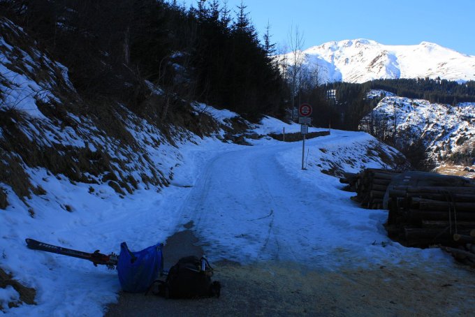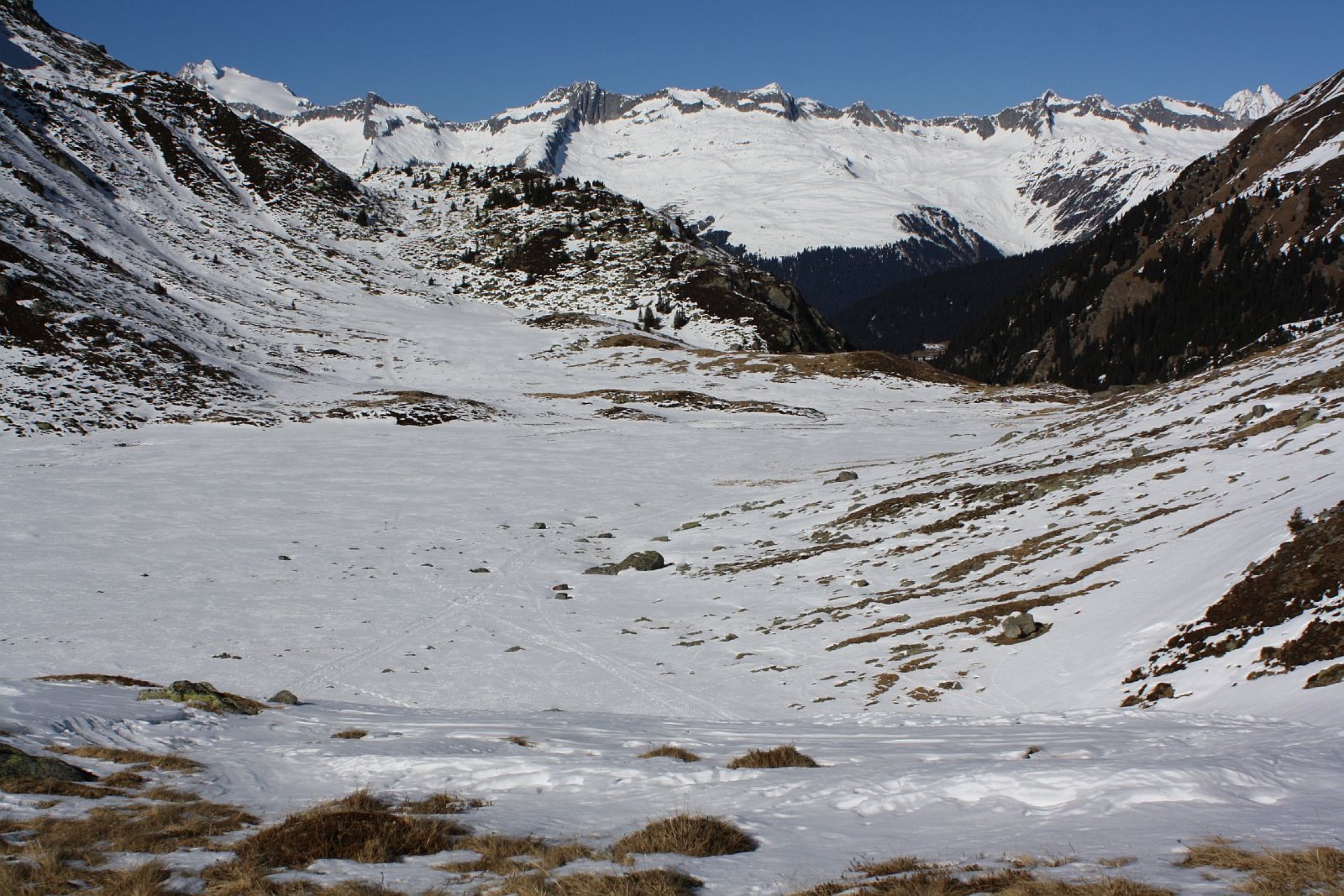 Von Curaglia (1332m) ans östliche Dorfende zu einem Holzsägewerk und auf der Alpstrasse ins Val Plattas zu P.1648m. Je nach Schneeverhälnisse auf der Ost- oder Westseite des Rein da Plattas taleinwärts zur Alp Sura (1982m). Nun allmähich nach Osten abbiegend in eine breite Talmulde am Fusse der Felsen Sut Glatscher bis zu einer Verengung. Hier stösst die Route von der Medelserhütte SAC dazu.