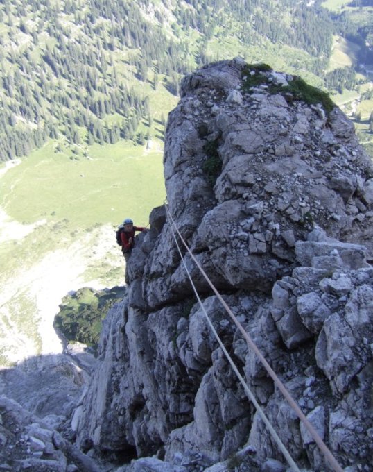 Trotz der relativ geringen Kletterschwierigkeit nicht zu unterschätzen! Eine lange alpine Angelegenheit mit viel Schutt auf den Bändern, unübersichtlichem Gelände und düsterem Nordwandflair! Mit Sonne erst am späteren Nachmittag. Die schwierigsten Kletterstellen sind in ordentlichem Fels und gut mit Bohrhaken gesichert. Es stecken mehr als im Panico-Topo angegeben. Auch die Standplätze sind perfekt eingerichtet und bequem. Ansonsten gibt es ein paar brüchige Stellen, der Fels ist etwas rundlich und braucht nach Regen zwei Tage zum trocknen. Abstieg: Vom Ausstieg geht es über steiles Gras (Vorsicht bei Nässe) und dann rechtshaltend über leichten Fels auf den Grat des Hindelanger Klettersteigs nach Westen. Abbruchmöglichkeit im Bereich der Nebelhornseilbahn bei unsicherer Witterung. Hier kann auch ein Gipfelbier getrunken werden!!