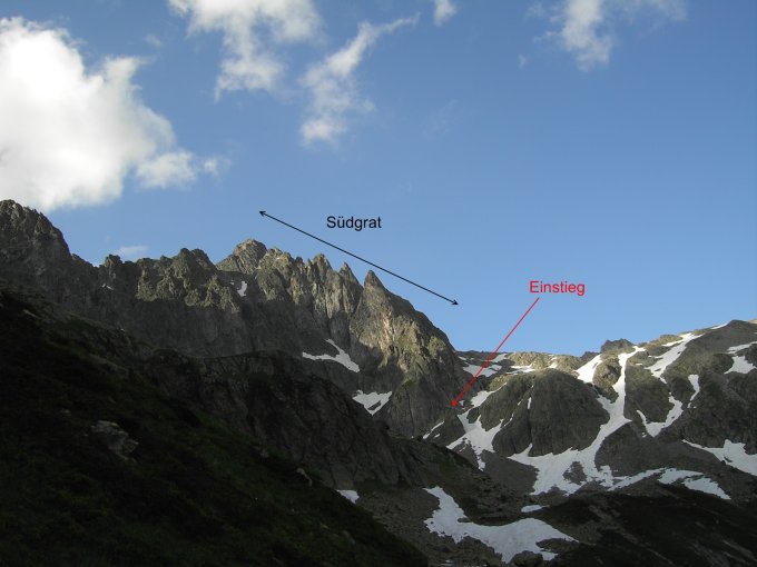von der Hütte dem markierten Weg folgen zum Seewenstöss.100m durch das Couloir östlich vom S-Grat aufsteigen und über plattige Felsen links zum Einstieg bei Grasterrasse. Vom Couloir an weiss markiert