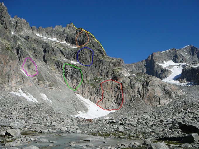 Mit Kombination von Sektor "Joshi" + "Sidelenwand" + "Gipfelwand" (oder auch "Wandfussplatten") besteht die Möglichkeit ganze 560 HM zum Gipfel zu klettern.