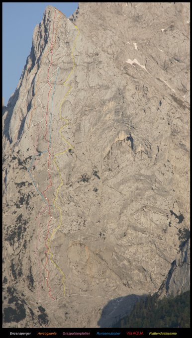 Herrliche Platten- und Wandkletterei durch die höchste Wandflucht im Wilden Kaiser. Die Route führt zwischen ?Plattendirettissima? und ?Graspolsterplatten? in direkter Linie über das erste Hufeisen und durch die drei Dachriegel zu den Platten im oberen Wandteil. Über diese erst den ?Runsenrutscher?, dann die ?Enzensperger? und schlussendliche die ?Herzogkante? kreuzend zum 2116 m hohen Gipfel der Kleinen Halt. Die Route verlangt viel Ausdauer sowie einen klaren Kopf - welcher nach einer Nacht im gemütlichen Hans-Berger-Haus nicht immer selbstverständlich ist -:)