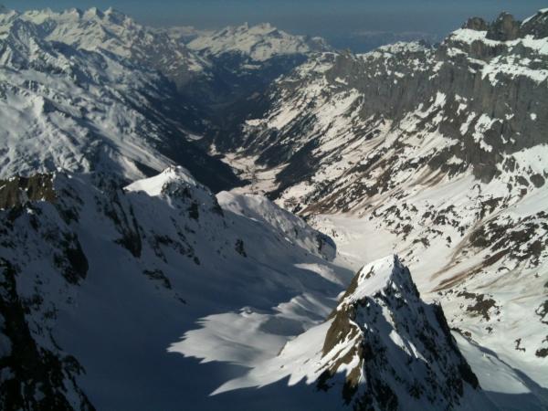 Vom Steingletscher 1865m entlang dem Sommerweg Richtung Obertal. Je nach Schneeverhältnissen müssen die Skier z.T. getragen werden.