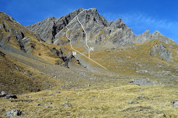 Die Route durch die Südostflanke muss ab Tersol selbständig gefunden werden, es sind keinerlei Markierungen vorhanden.
