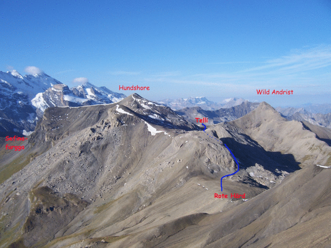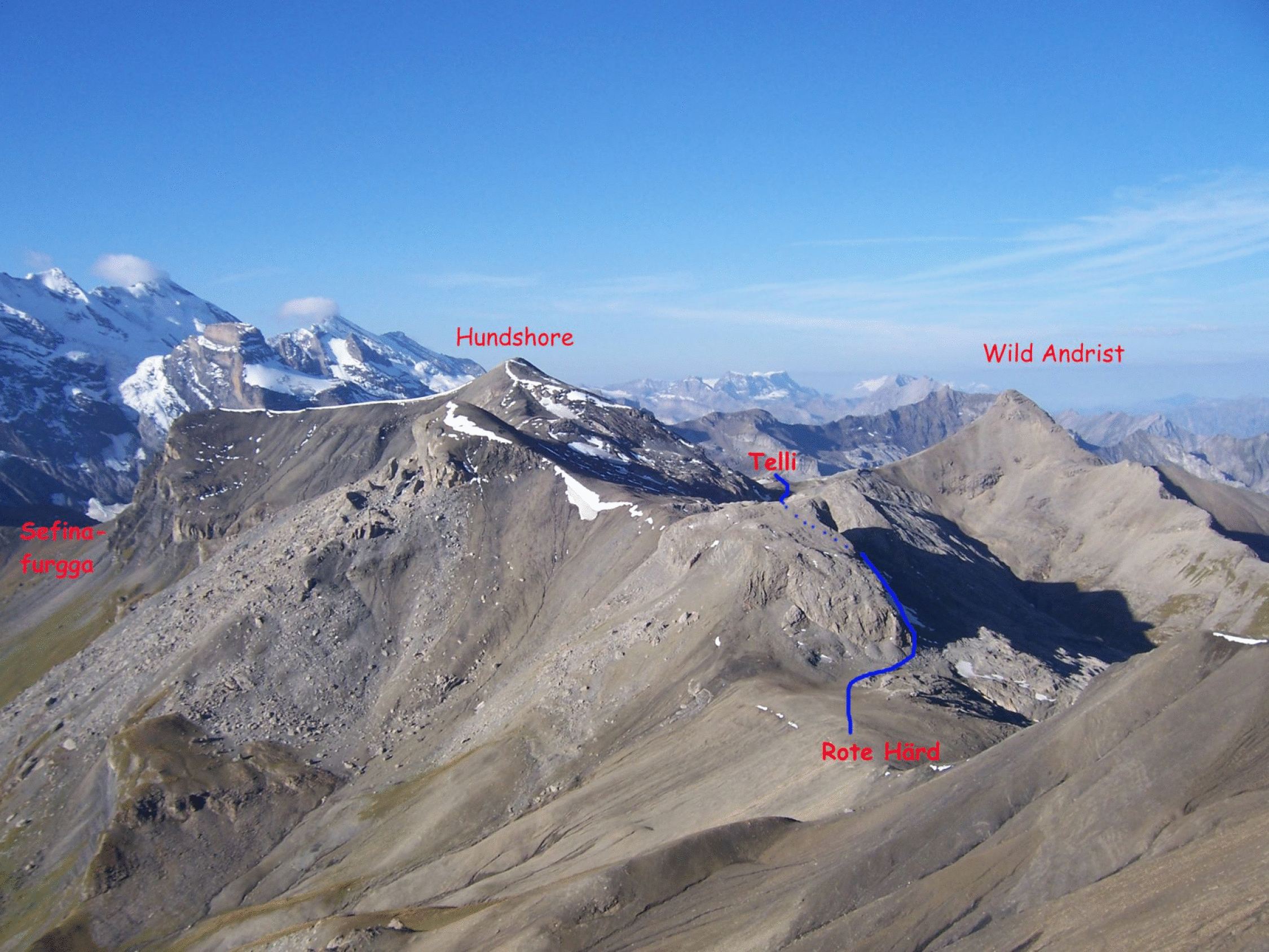 Vom Wegweiser am Rote Härd 2683m dem breiten Schuttrücken nach SW folgen. (spärliche weiss-blau-weiss Markierung) Nach ca. 200m nach W haltend, später an Felswand blau (Zum Tellipass)und immer den wenigen Wegspuren und Markierungen bis ins Telli folgen. Bei Nebel sehr schwierige Orientierung!